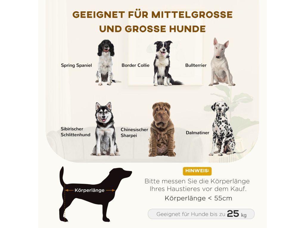 - ✔ Vhodné pro střední a velké psy do 25 kg, doporučujeme, aby pes měřil méně než 55 cm