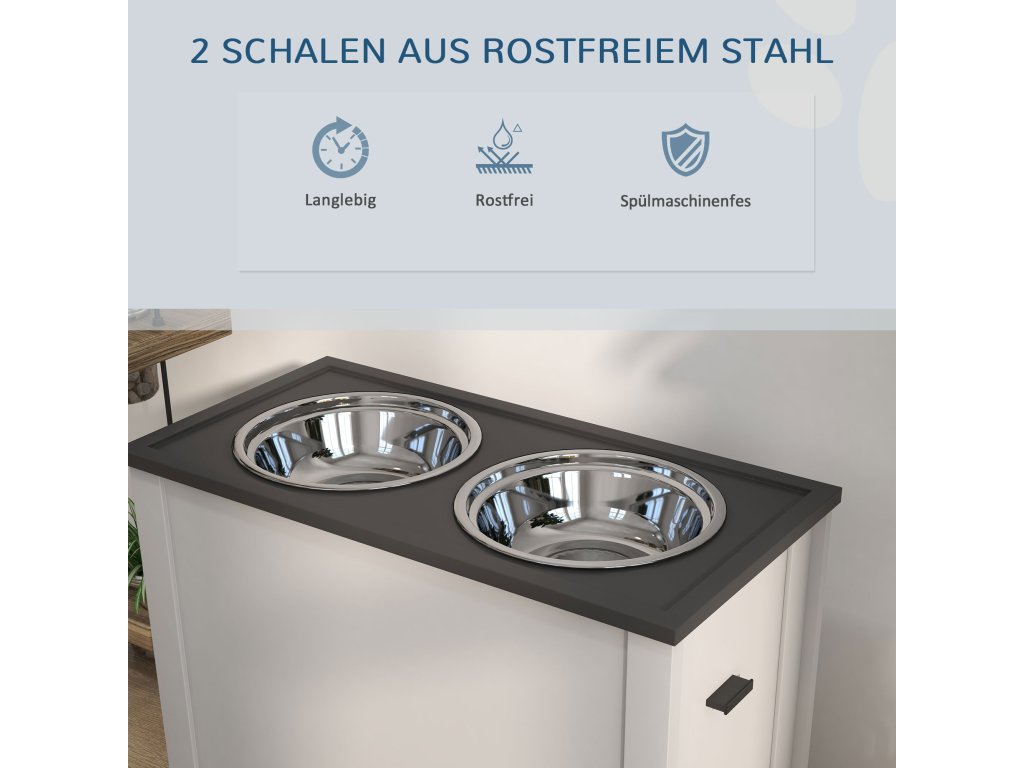 PawHut miska pro psy, krmící stanice pro psy s úložným prostorem, miska na vodu, stojan na misky s 2litrovými nerezovými miskami, stojan na misky pro psy, miska na krmivo pro velké psy, bílá barva