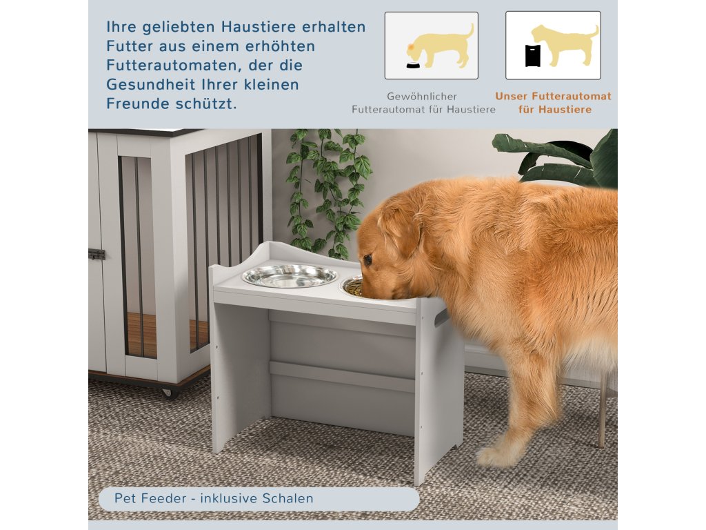 - Moderní styl: Krmicí stanici vyrobenou z vysoce kvalitních tmavě hnědých dřevěných desek lze kombinovat s dalším nábytkem ve vaší domácnosti. Krmná stanice je vybavena vyvýšenou základnou, která snižuje zátěž na krk, záda a klouby psů