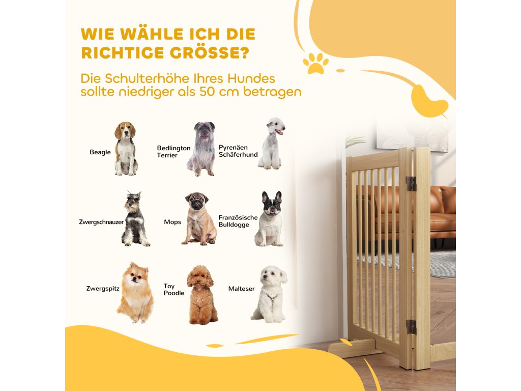 PawHut ohrádka pro psy 4-dílná 204 x 75 cm skládací s dvířky, volně stojící ohrádka pro psy ze dřeva se 2 opěrnými nožičkami pro chodbu kuchyň schody příroda | Aosom.de