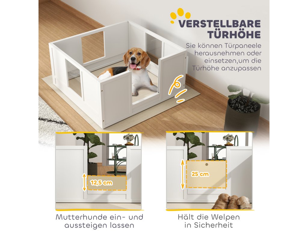 PawHut porodní box pro štěňata, výběh pro štěňata s nastavitelnými dvířky, protiskluzové podložky pod nohy, ohrádka pro štěňata až středně velkých plemen psů, 100 x 96 x 48 cm, bílý