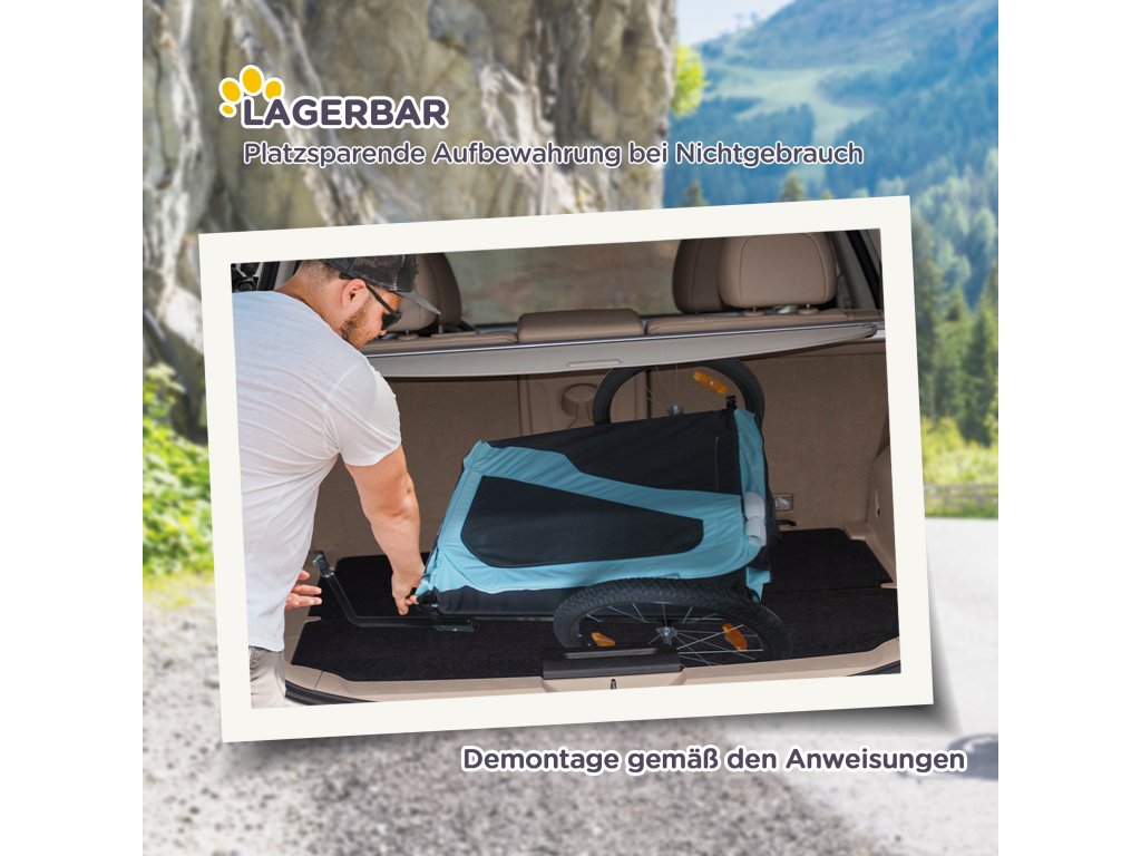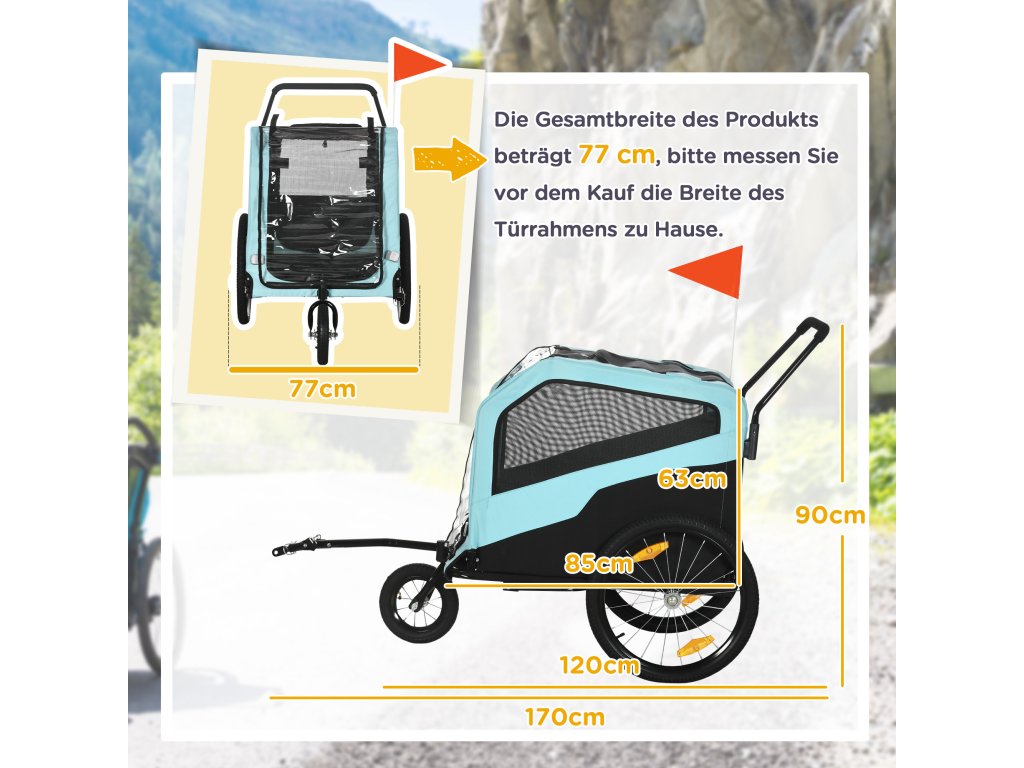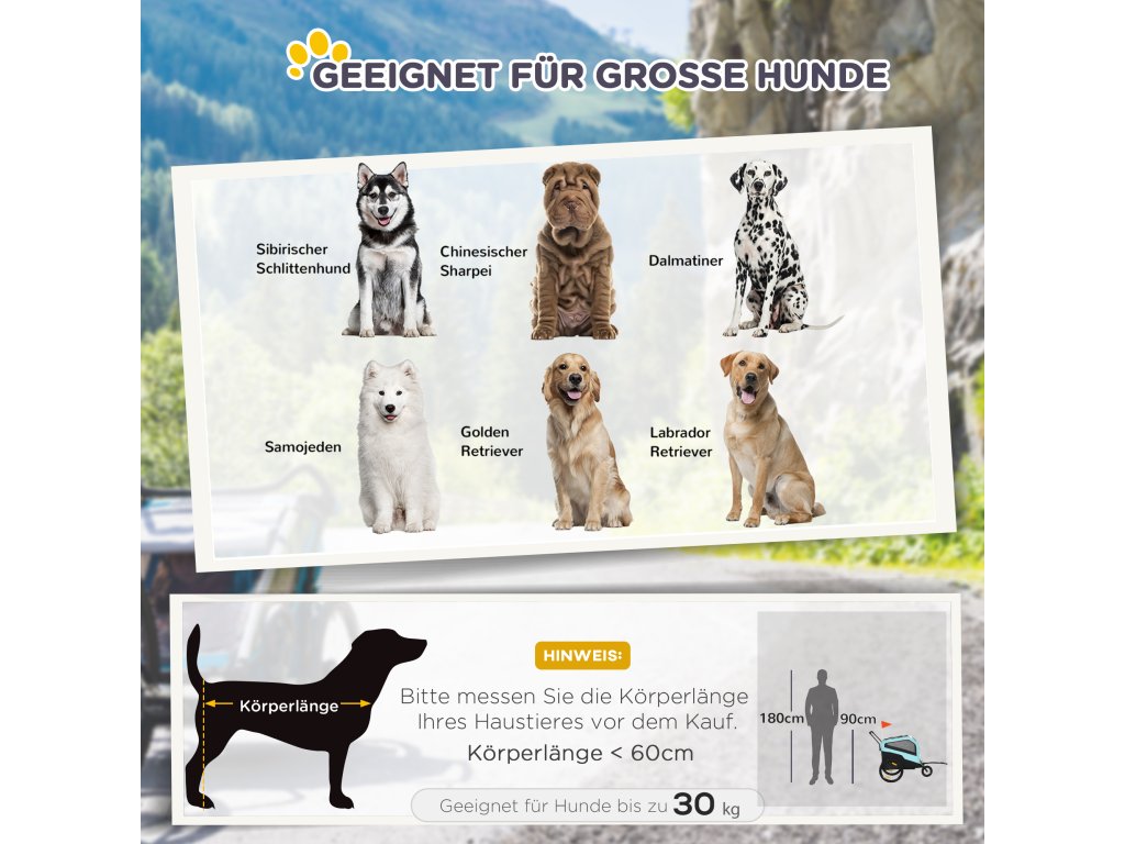 - konstrukce 2 v 1: Tento kočárek lze použít jako tříkolový kočárek pro psa, který tlačíte, když jdete na procházku, nebo jako přívěs na kolo, který připevníte na kolo při cyklistických výletech. Tento multifunkční přívěs je vhodný pro velké psy do délky 60 cm a hmotnosti 30 kg.
