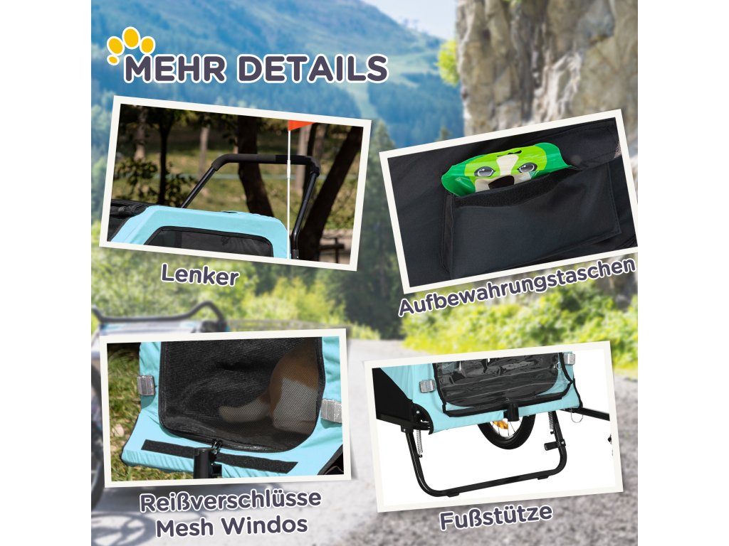 Užijte si se svým psem úžasná venkovní dobrodružství v tomto multifunkčním přívěsu pro psy od společnosti PawHut. Dvoje velké dveře na zip usnadňují vašemu čtyřnohému příteli vstup a výstup, zatímco síťovaná okna zajišťují, že si váš mazlíček může vždy užívat čerstvého vzduchu a nerušeného výhledu. Několik odrazek a červený praporek zajišťují dobrou viditelnost v silničním provozu. Díky odnímatelným kolečkům lze kočárek také mimořádně kompaktně skladovat.
