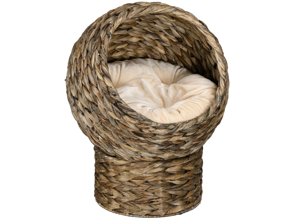 PawHut ratanový koš pro kočky útulná kočičí jeskyně s polštářem, pelíšek z vodního hyacintu tmavě hnědý 42x33x52cm pro odpočinkové kočky | Aosom.de