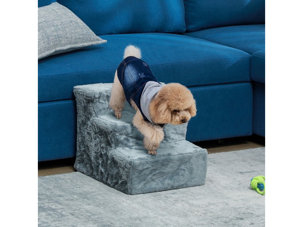 PawHut schody pro psy 3 stupně 35 cm schody pro domácí mazlíčky s plyšovým vzhledem, schody pro kočky do postele, na pohovku, pro kočky do 5 kg, světle šedé | Aosom