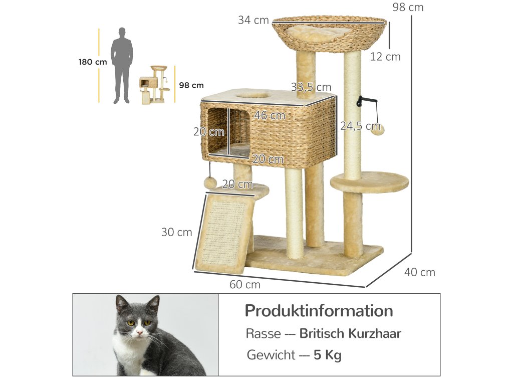 - Rozměry škrabadla pro kočky: 60 Š x 40 H x 98 V cm. Kočičí jeskyně: 46Š x 33,5D x 24,5V cm. Vhodné pro kočky do 6 kg. Nutná montáž.