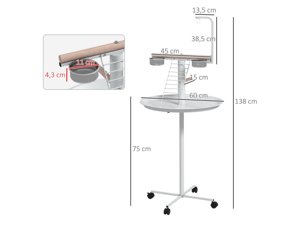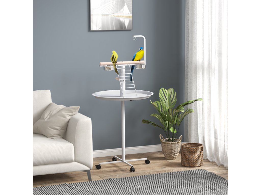 Poskytněte svému ptáčkovi místo na hraní a odpočinek díky stolku PawHut. Je vybaven čtyřmi kolečky, z nichž dvě mají brzdy, a lze jej tak bez námahy přesouvat mezi místnostmi nebo z interiéru do exteriéru. Díky hrazdičce, žebříku a houpačce a 2 nerezovým táckům splňuje každodenní potřeby ptáků. Tento ptačí stolek je vyroben z oceli a dřeva a je určen pro každodenní použití. Zpestřete svému domácímu mazlíčkovi život s PawHut!