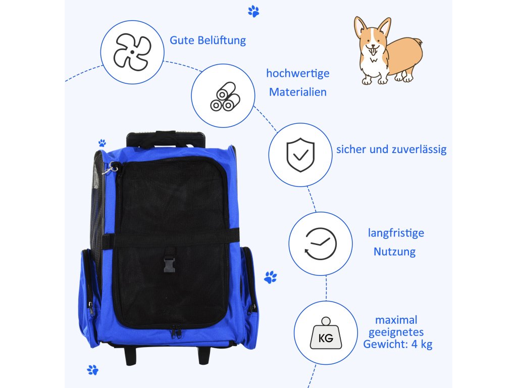 Snadná a pohodlná přeprava pro vás i vašeho domácího mazlíčka. Ať už jako přepravní box, batoh s polstrovanými ramenními popruhy nebo vozík s výškově nastavitelnou rukojetí, je to ideální způsob přepravy vašeho domácího mazlíčka. Robustní a nepromokavá tkanina 600D Oxford zajišťuje odolnost. Vložky ze síťoviny po celém obvodu umožňují dostatek čerstvého vzduchu do interiéru a zajišťují volný výhled ven. Na každé straně je kapsa pro uložení vodítka, pamlsků nebo jiných potřeb pro domácí mazlíčky. Integrováno je také krátké vodítko, které můžete použít, pokud chcete například nechat přední část otevřenou. Díky tomu se nemusíte obávat, že by váš mazlíček vyskočil ven. Díky měkkému polstrování je přeprava pohodlná pro vašeho mazlíčka a díky všestrannému využití i pro vás.