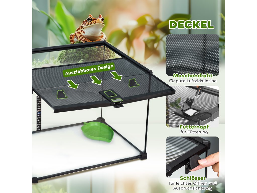 - Dobrá cirkulace vzduchu: Víko je vyrobeno z drátěného pletiva, které zajišťuje dostatečné větrání odpovídající potřebám plazů. Výsuvné horní víko obsahuje otvor pro snadné krmení.