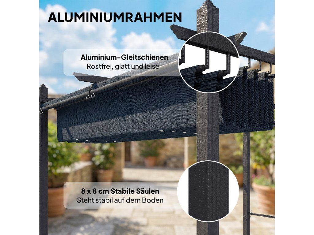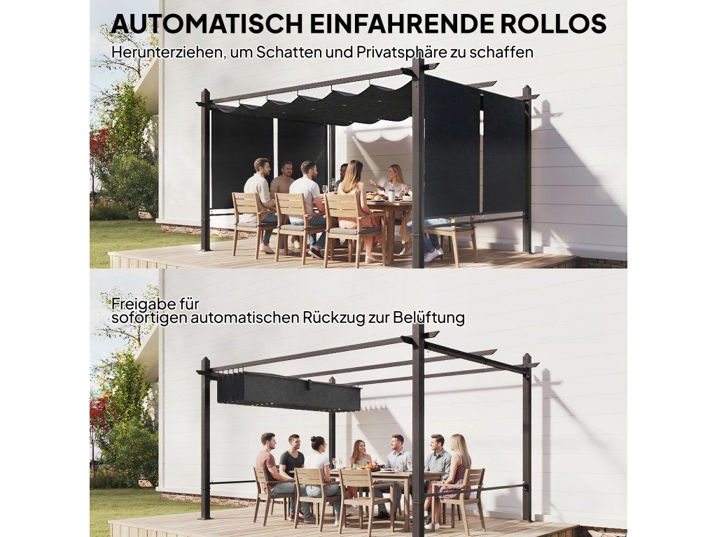 Odpočívejte na slunci nebo ve stínu s pergolou [NÁZEV ZNAČKY] se zatahovací střechou. Střecha s PA povlakem o hmotnosti 180 g/m² nabízí ochranu proti UV záření UV50+ a automaticky zatahovací žaluzie zaručují pohodlí a soukromí. Toto zastřešení terasy s hladkými hliníkovými kolejnicemi, vyrobené z nerezavějícího hliníku a bezpečně upevněné pomocí zemních kotev nebo rozpěrných šroubů, nabízí stabilní a příjemný pobyt venku!