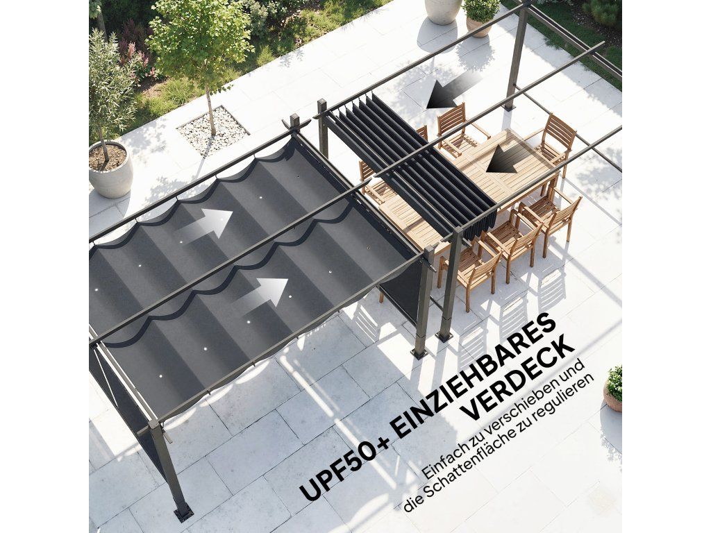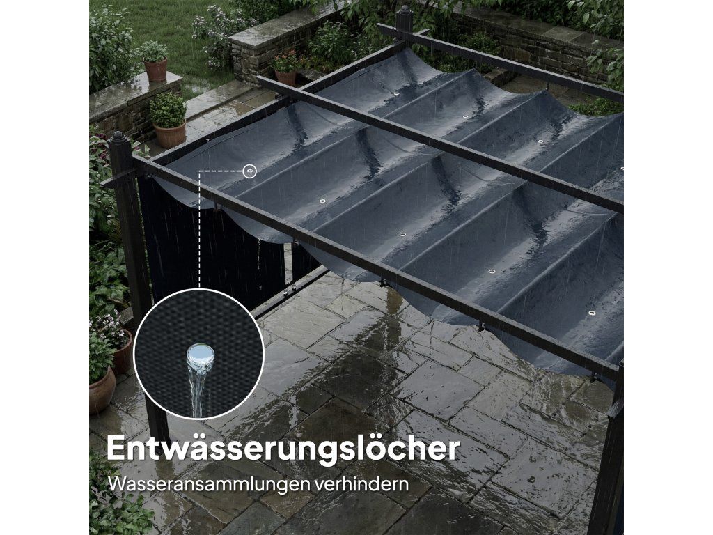 - Stahovací konstrukce střechy: Užívejte si dokonalou kombinaci slunečního světla a stínu díky střeše pergoly s PA povlakem o hmotnosti 180 g/m², kterou lze přizpůsobit a která je vybavena ochranou proti UV záření UV50+.