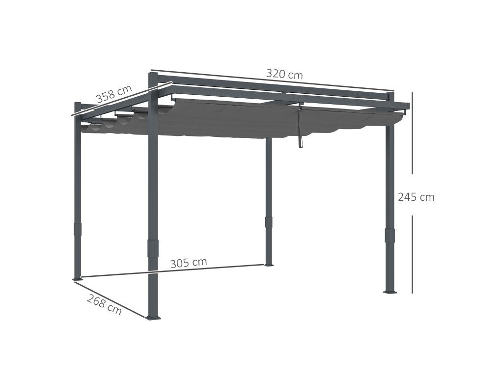 - Rozměry stříšky pergoly: 358L x 320W x 245H cm. Rozteč sloupků: 268L x 305W cm. Nutná montáž.