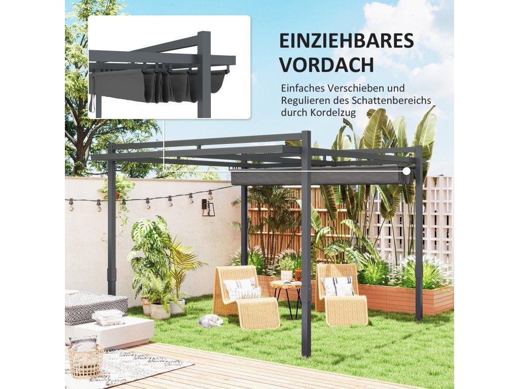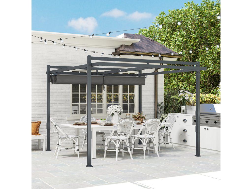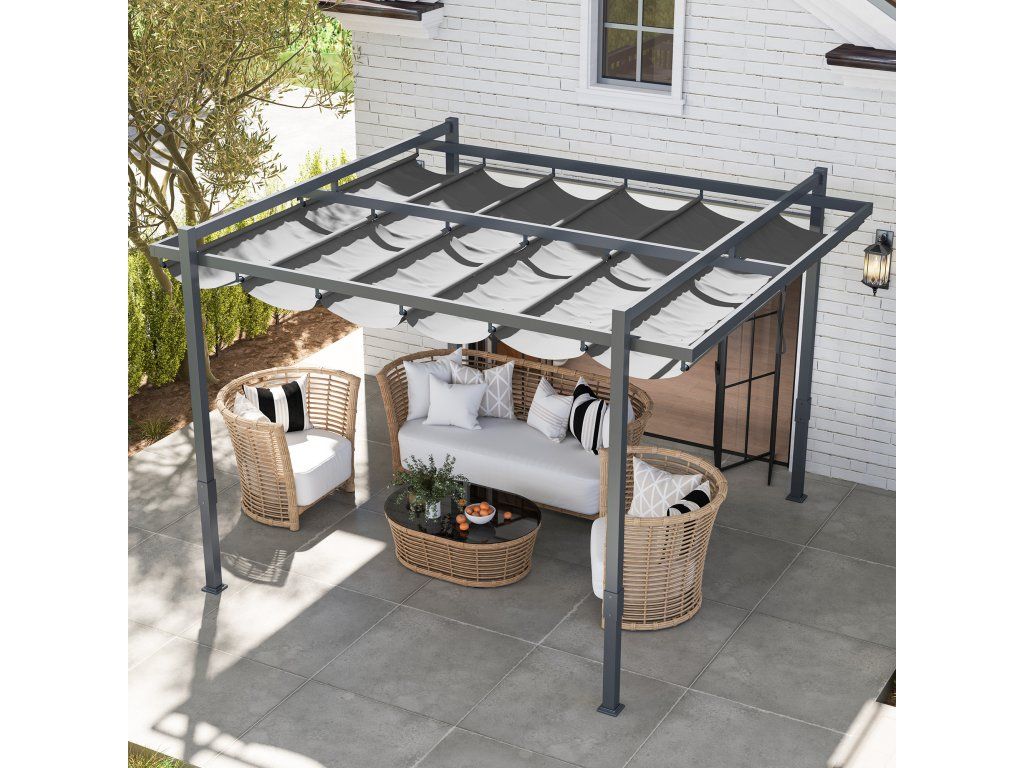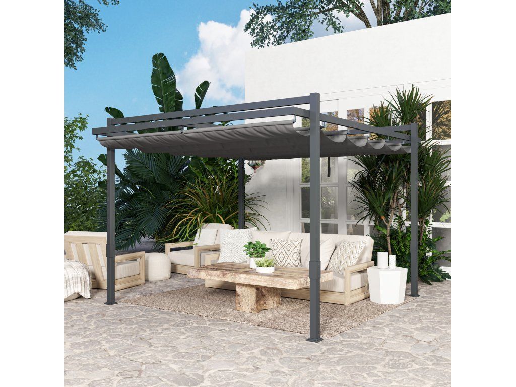 - Stahovací stříška: Tato pergola je vybavena stylovou stahovací stříškou na hladkých kluzných kolejničkách, která vám umožní snadno nastavit stín jednoduchým zatažením za šňůrku a užívat si optimální pohodlí a kontrolu ve vašem venkovním prostoru po celý den.