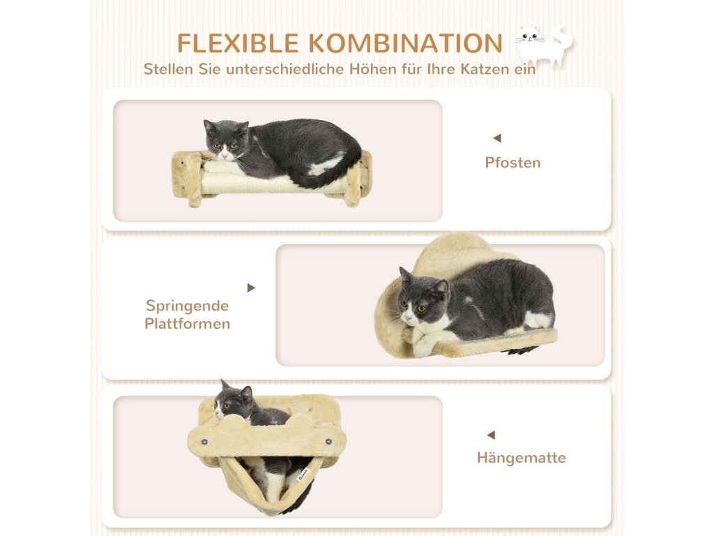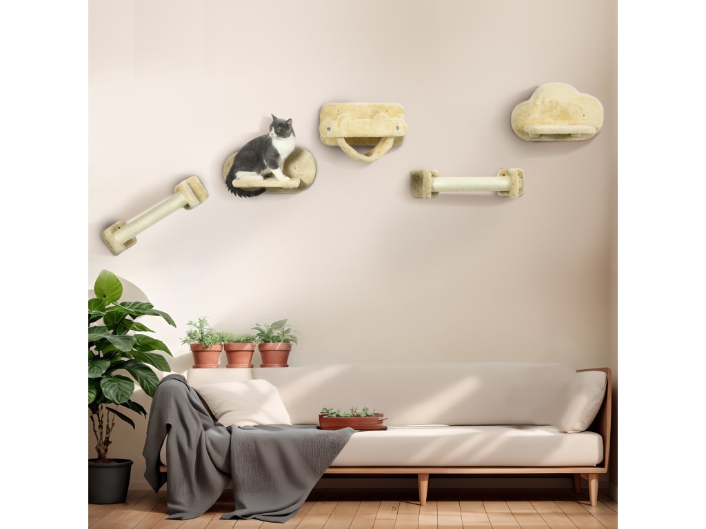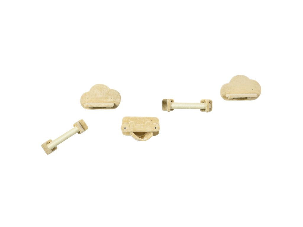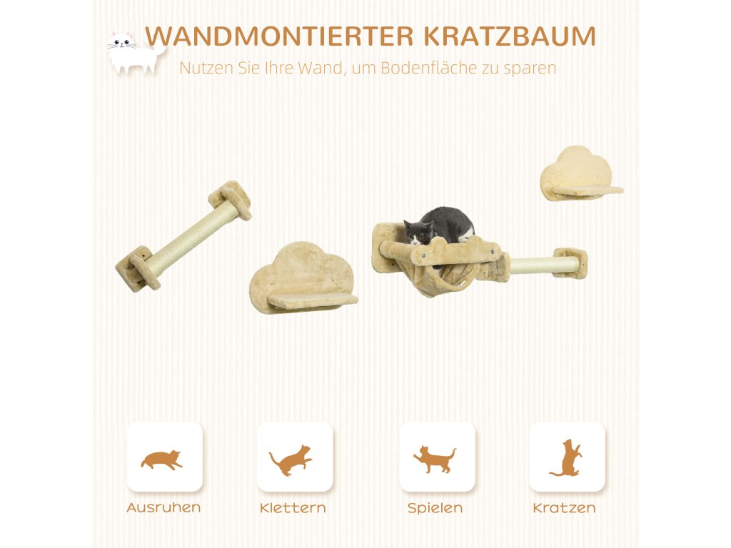 Pětidílná sada prolézaček pro kočky PawHut se schody ve tvaru roztomilého mráčku, 2 škrabadla, plošiny, plyšová houpací síť, béžová | Aosom.de