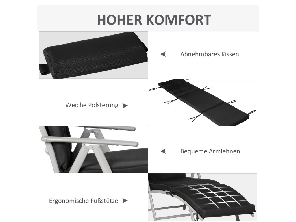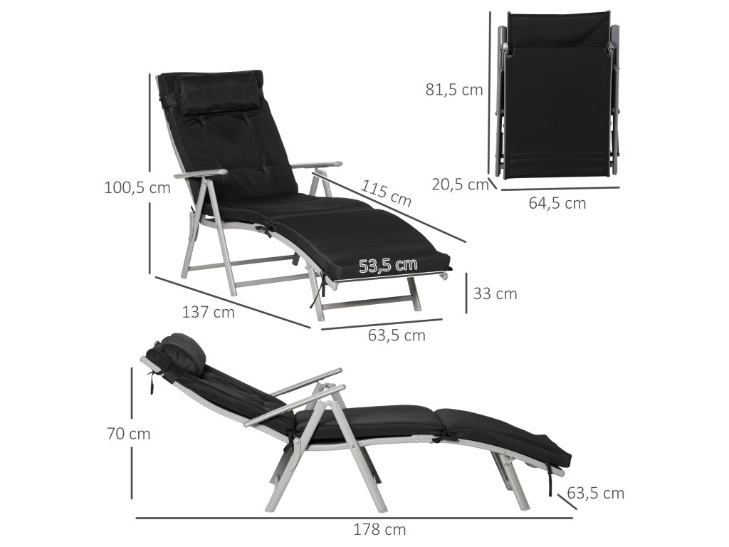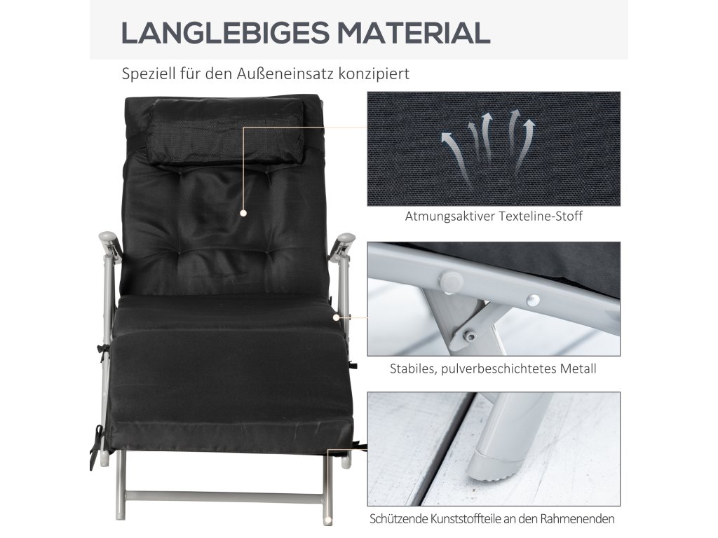 Udělejte si pohodlí na tomto vynikajícím plážovém lehátku od společnosti Outsunny! Toto zahradní lehátko má robustní kovový rám s práškovým nástřikem a unese až 165 kg. Úhel opěradla lze nastavit v sedmi stupních, takže si rychle najdete ideální polohu pro sezení nebo ležení. Prodyšný potah sedáku z tkaniny Texteline a dodávaný polštářek poskytují dodatečné pohodlí. Lehátko lze snadno složit pro úsporu místa při skladování.