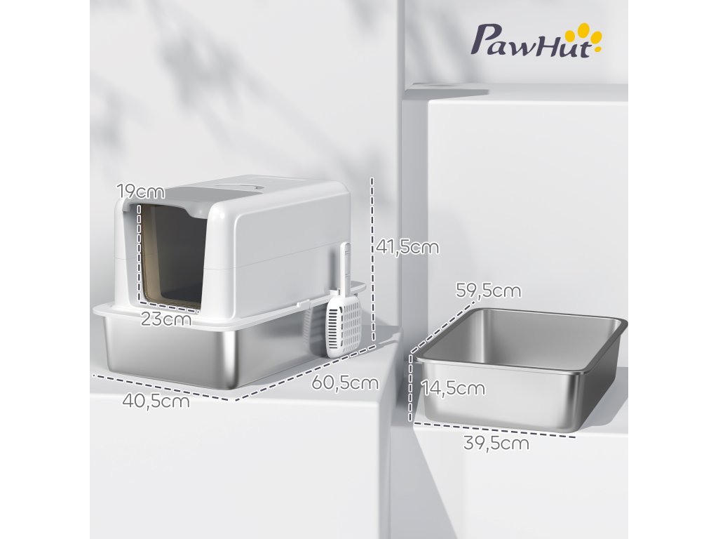 Podestýlka PawHut, kočičí toaleta s víkem, nerezová vanička, vestavěný filtr na stelivo, lopatka na stelivo součástí balení, pro kočky do 6 kg, bílá