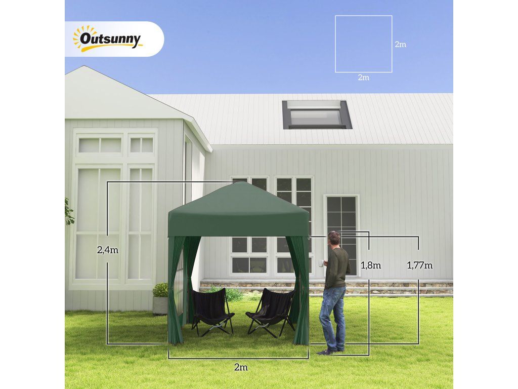 - Přenosná taška v ceně: Přenosná taška pro snadné skladování a přepravu. Celkové rozměry pop-up altánu: 2L x 2W x 2,4H m, výška okapu: 1,96 m