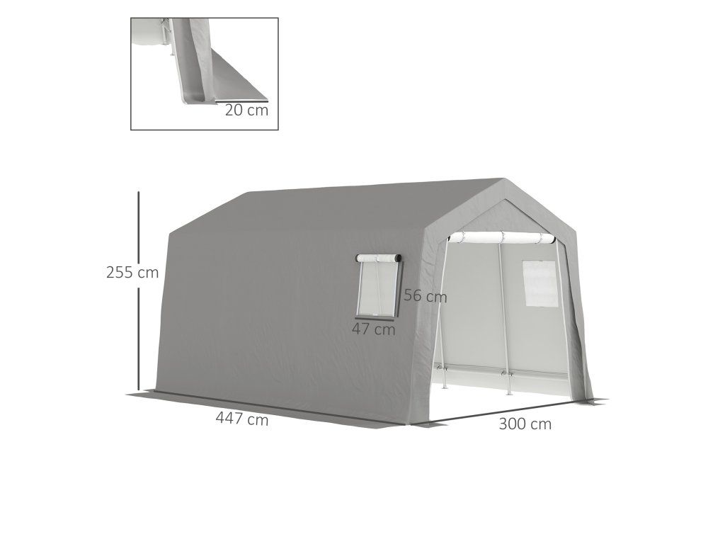 - Celkové rozměry garážového stanu: 300L x 447W x 255H cm. Výška okapu: 200 cm. Nutná montáž.
