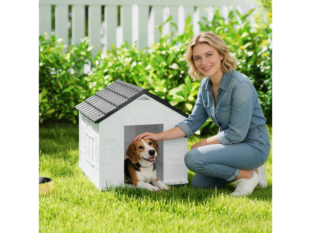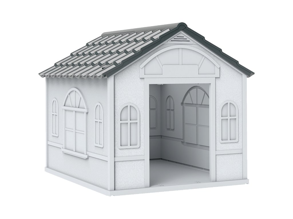 - Vysoce kvalitní materiály: Tato psí bouda je vyrobena z odolného plastu, snadno se čistí a je odolná vůči povětrnostním vlivům. Šikmá střecha zajišťuje snadné odtékání deště a sněhu