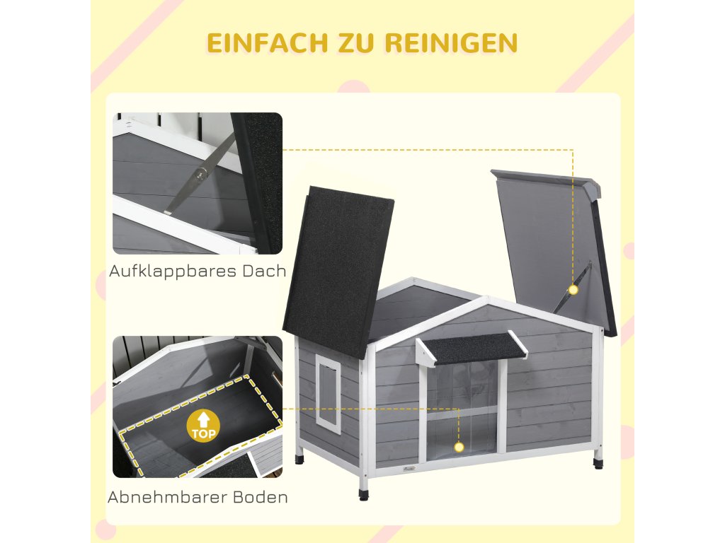 Psí bouda PawHut z jedlového dřeva odolná proti povětrnostním vlivům s otevírací asfaltovou střechou a odnímatelnou podlahou šedá 109x79x72cm pro velké psy | Aosom.de