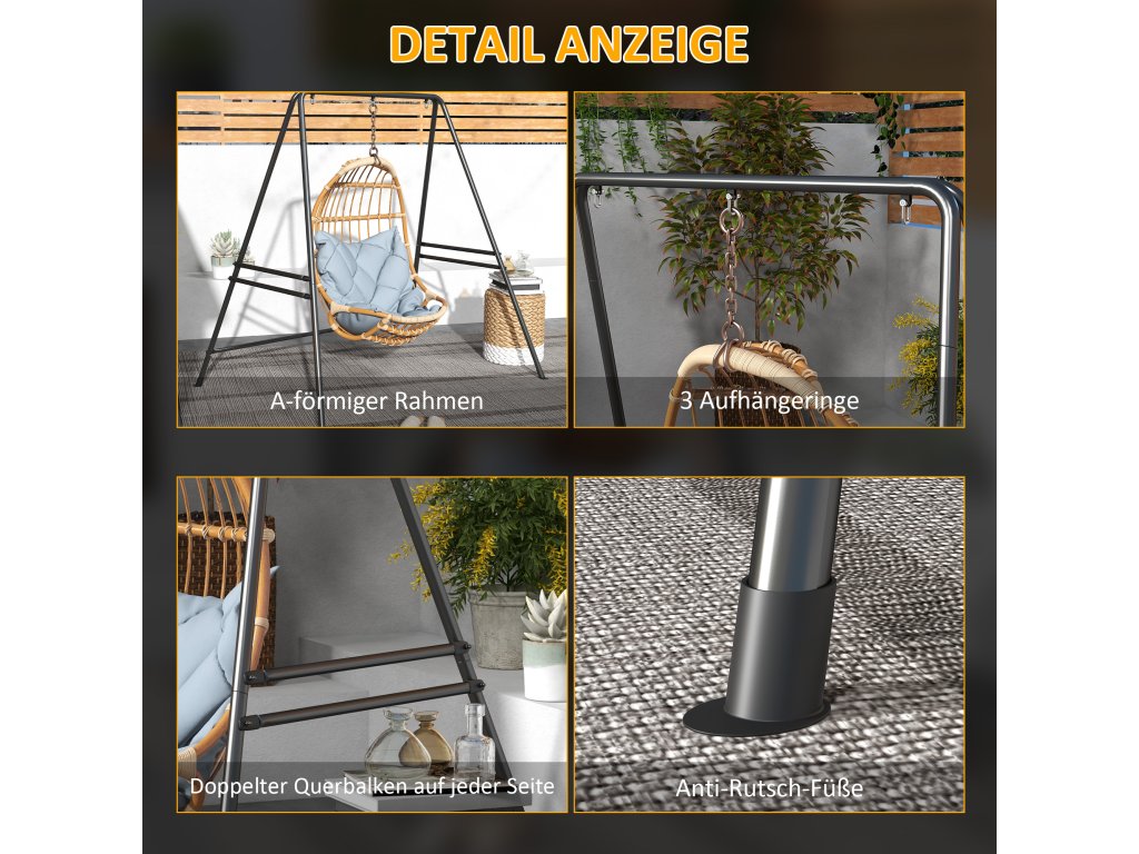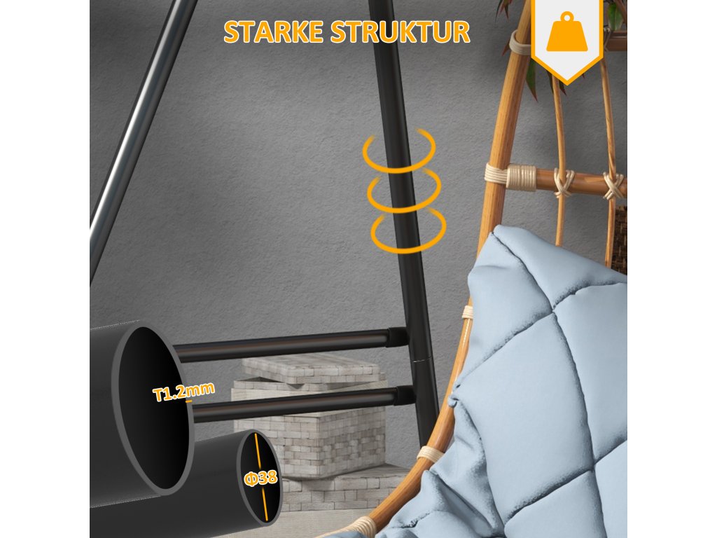- Vysoce kvalitní materiál: Náš rám závěsného křesla je vyroben z robustního kovového rámu o průměru Ø3,8 cm a vykazuje mimořádnou pevnost a odolnost. Práškově lakovaná povrchová úprava poskytuje dodatečnou ochranu proti všem povětrnostním vlivům