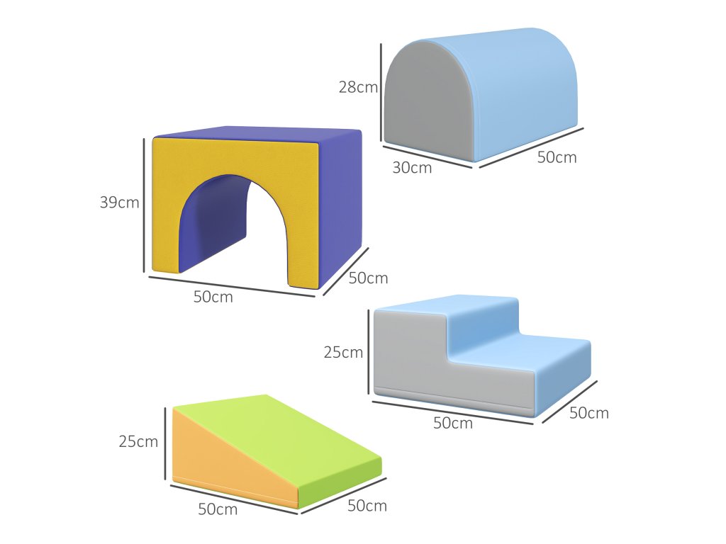 Pro rozvoj dětí v raném věku není nic lepšího než hračky, které podporují jejich dovednosti. Měkká stavebnice HOMCOM se čtyřmi pěnovými bloky, která se skládá z rampy, schodů, tunelu a půlválce, nabízí optimální zábavu na hraní. Děti mohou lézt, klouzat se a vypouštět páru, zatímco pěnové polstrování měkkých stavebních bloků zaručuje bezpečnost. Koženkový potah pěnových stavebních bloků se navíc snadno čistí.