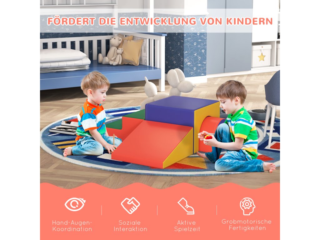 - 100% konfigurovatelnost: Čtyři pěnové stavební bloky pro děti lze uspořádat různými způsoby. Ať už je používáte jednotlivě, nebo jako kompletní hřiště - s žebříkem, rampou, tunelem a půlválcem - tato sada vaše děti zabaví na dlouhou dobu