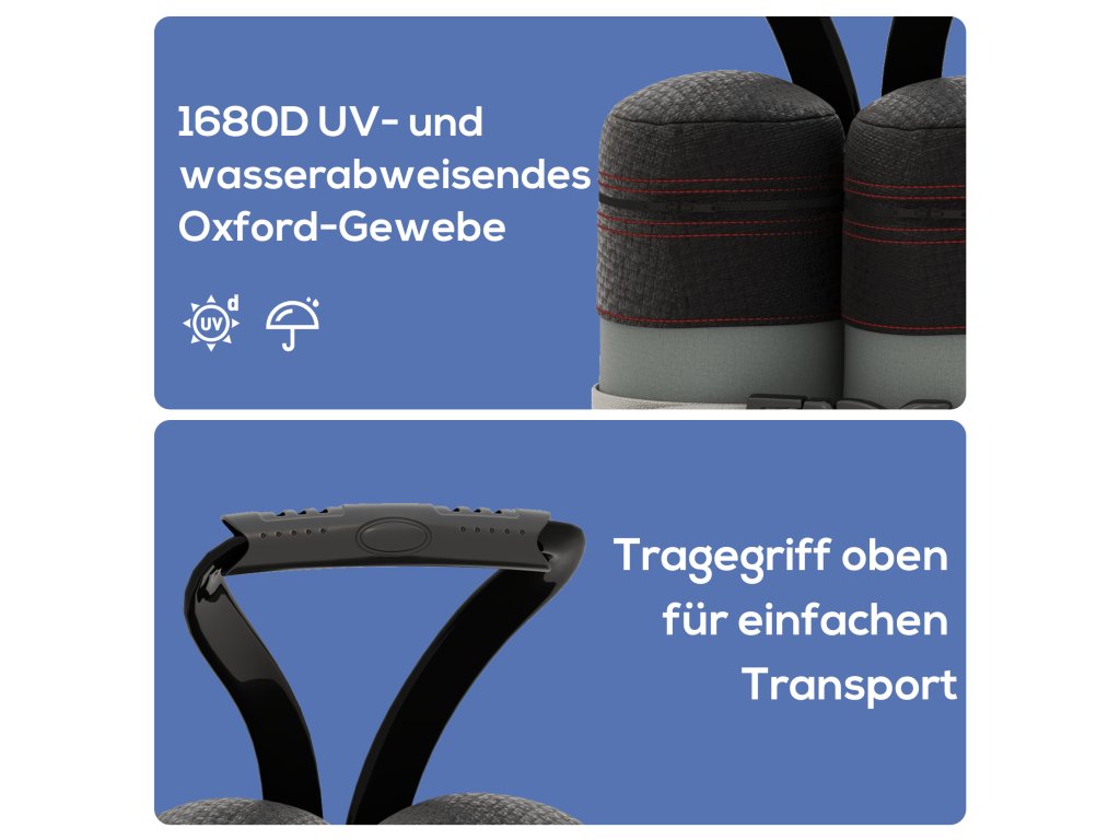 - Materiál odolný proti povětrnostním vlivům: Polyester Oxford je odolný proti UV záření a vodě - ideální pro dlouhodobé venkovní použití