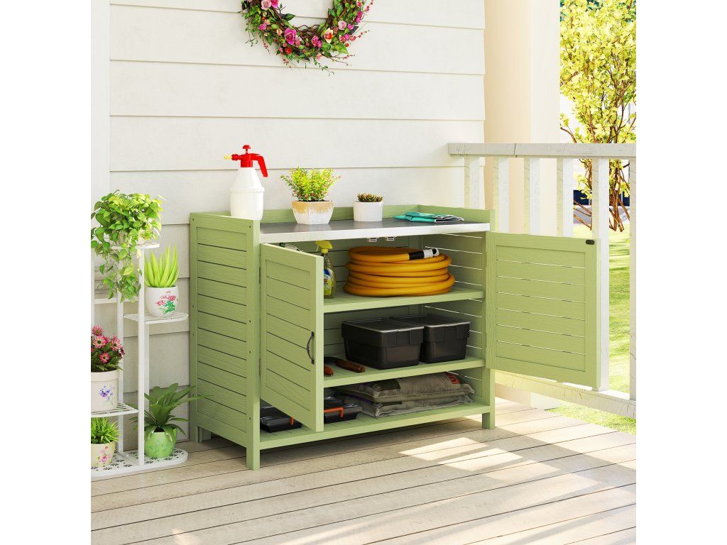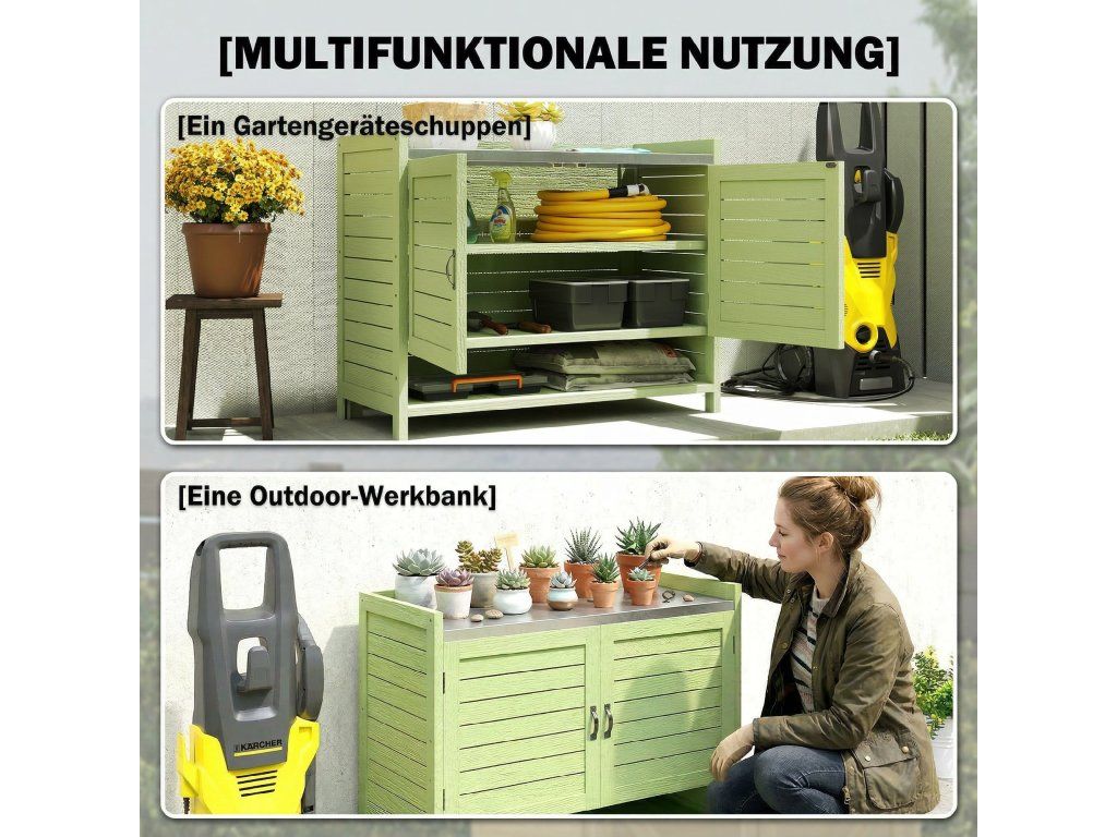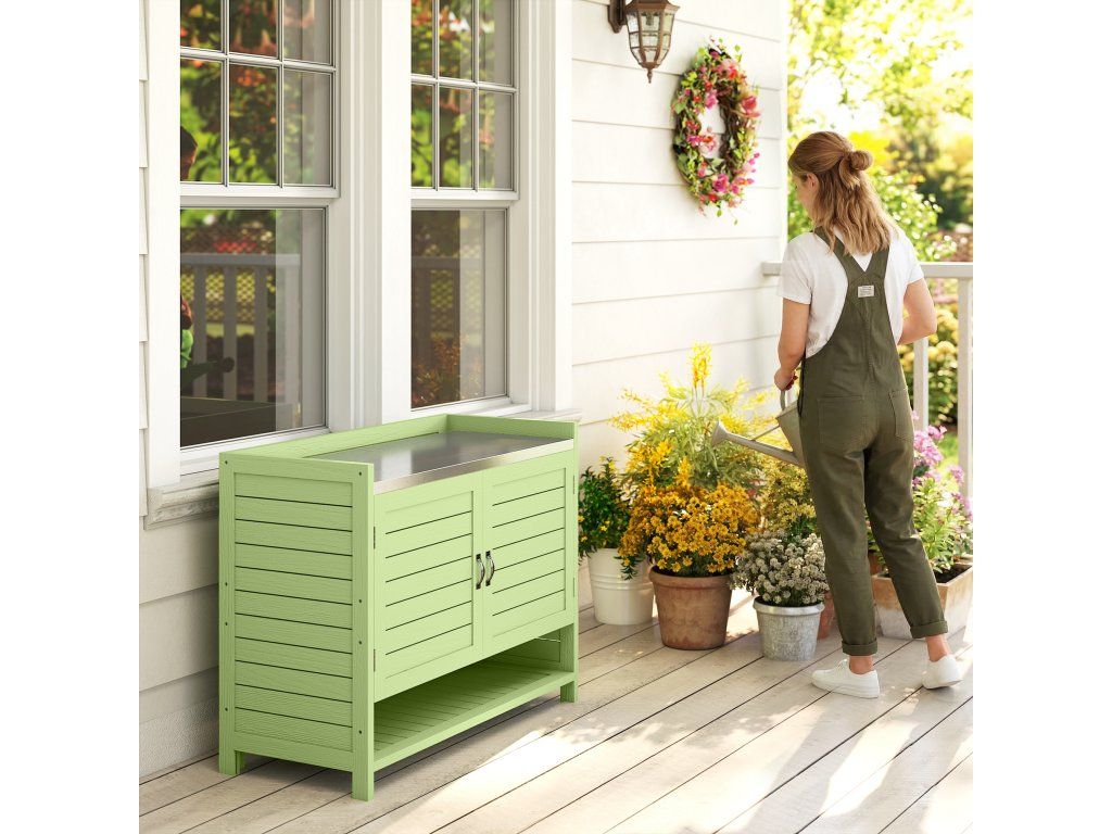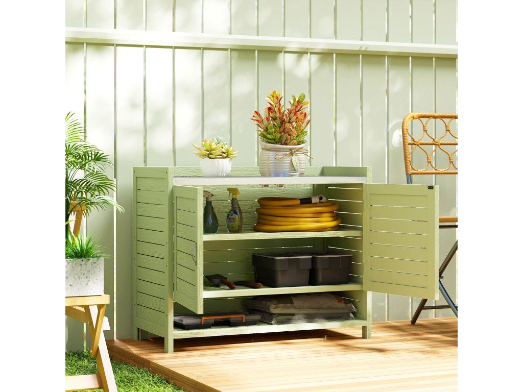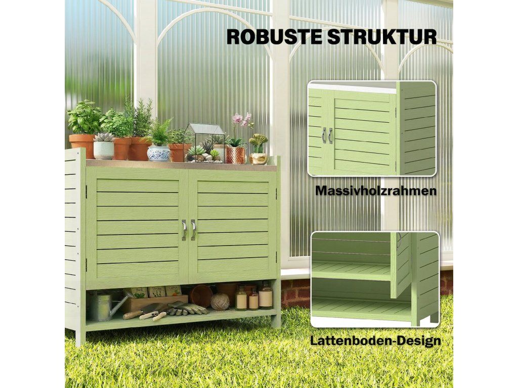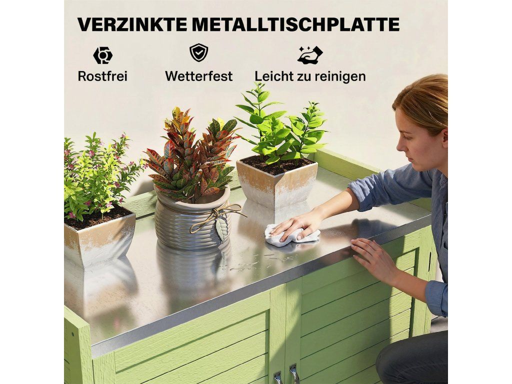 - konstrukce 2 v 1: Tento kompaktní malý přístřešek kombinuje praktický stůl na sázení s uzavřeným úložným prostorem pod ním. Ideální pro lehké zahradnické práce a pro udržování nářadí v pořádku a na dosah.
