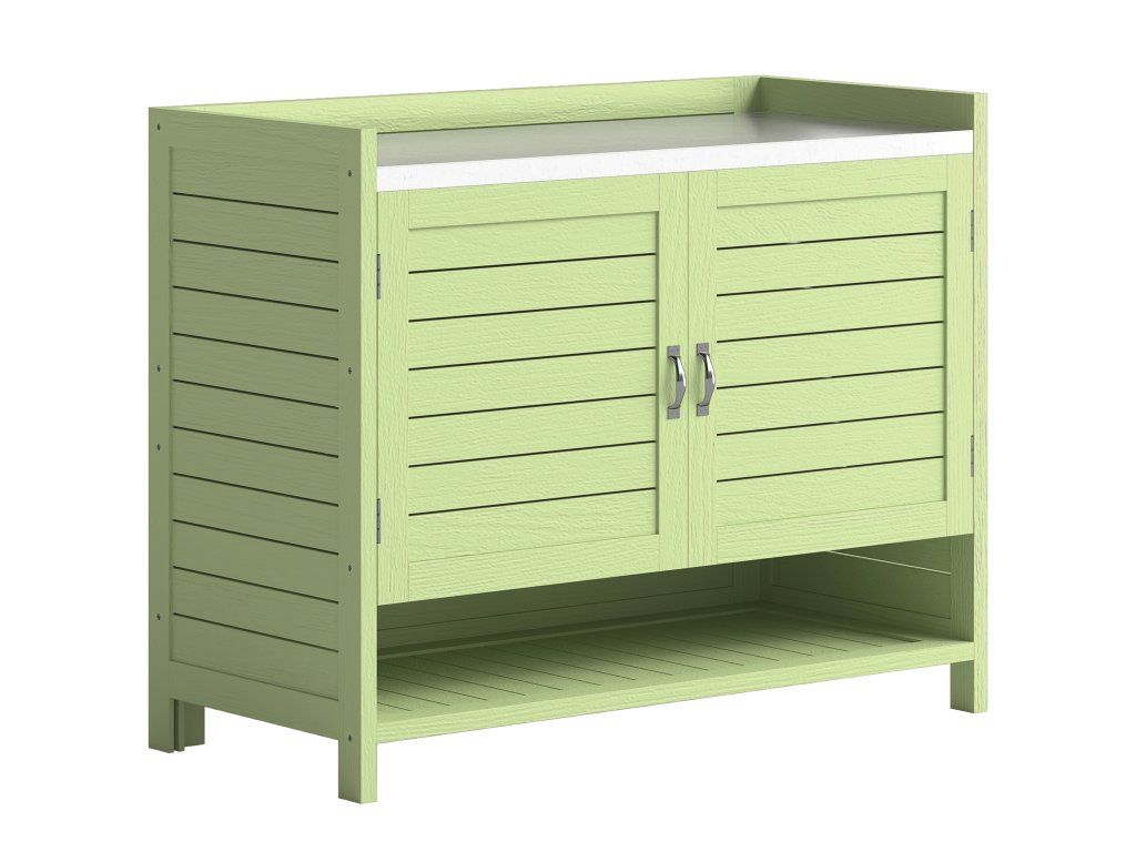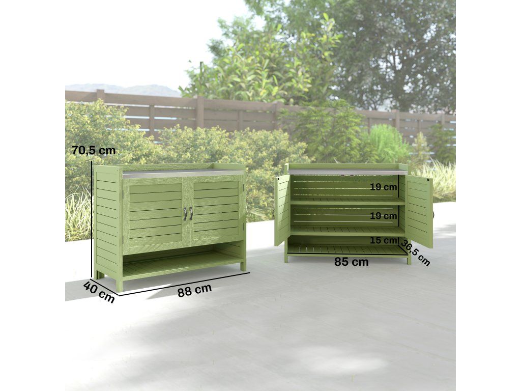 Sázecí stolek se skříňkou na dřevěném podstavci Venkovní zahradní skříňka s pozinkovanou pracovní deskou 3 police 88x40x70,5cm Zelená barva