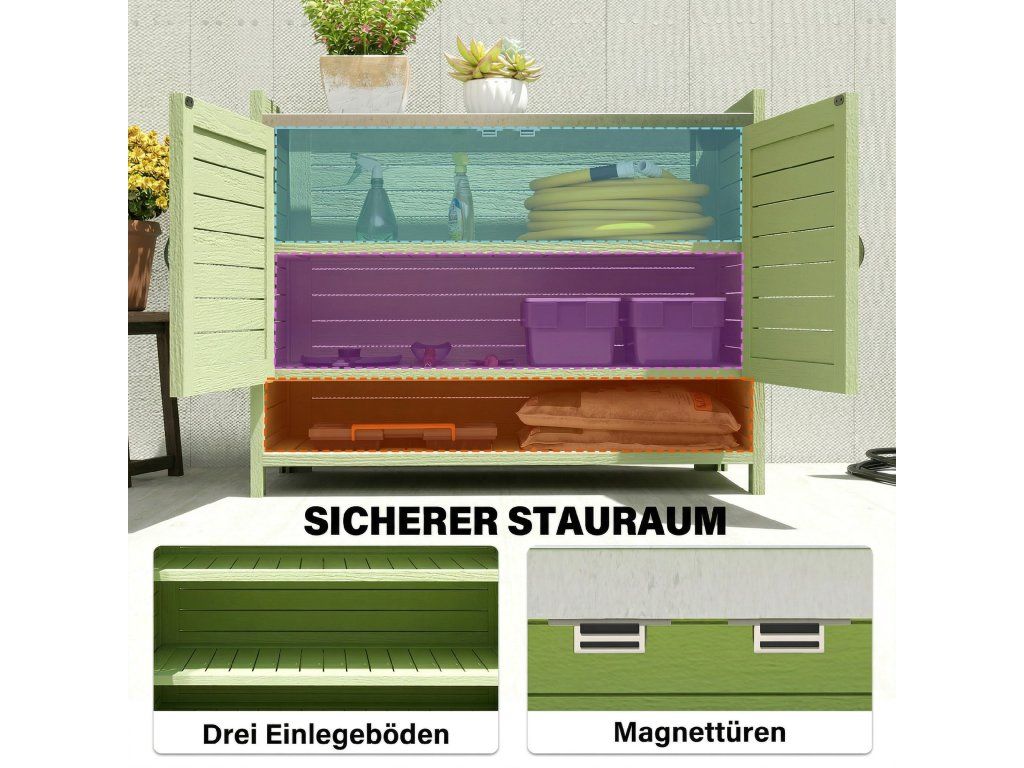 - Bezpečný úložný prostor: Venkovní stolek na rostliny odolný proti povětrnostním vlivům má dvojité dveře a tři police, z nichž jedna je otevřená, každá s nosností až 25 kg. Magnetické dveře zajišťují bezpečné a tiché otevírání a zavírání dveří skříně.