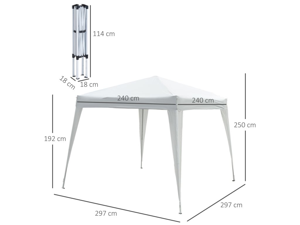 - ÚDAJE O VÝROBKU: Celkové rozměry: 240L x 240W x 250H cm, Světlá výška: 192 cm, Rozměry střechy: 240L x 240W cm, Rozměry při skládání: 123L x 20W x 20H cm
