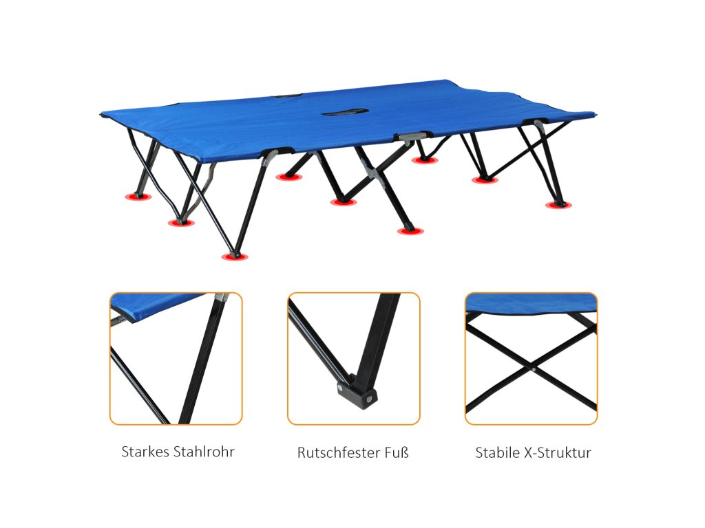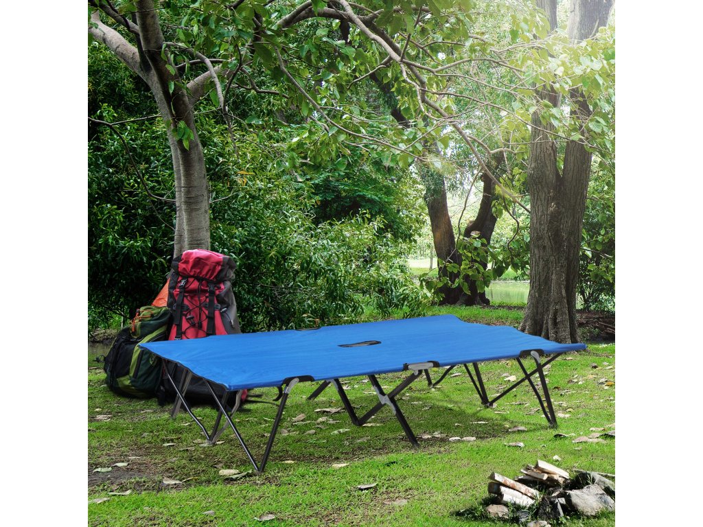 S touto skládací kempinkovou postýlkou pro dvě osoby od společnosti Outsunny budete mít na cestách vždy pohodlné místo k odpočinku. Tato lehká kempingová postel nabízí dostatek prostoru pro dvě osoby, takže při kempování nemusíte spát na studené tvrdé zemi. Ocelový rám a odolná tkanina Oxford snadno vydrží zatížení až 136 kg, zatímco zvýšená konstrukce zajišťuje dobrou cirkulaci vzduchu.