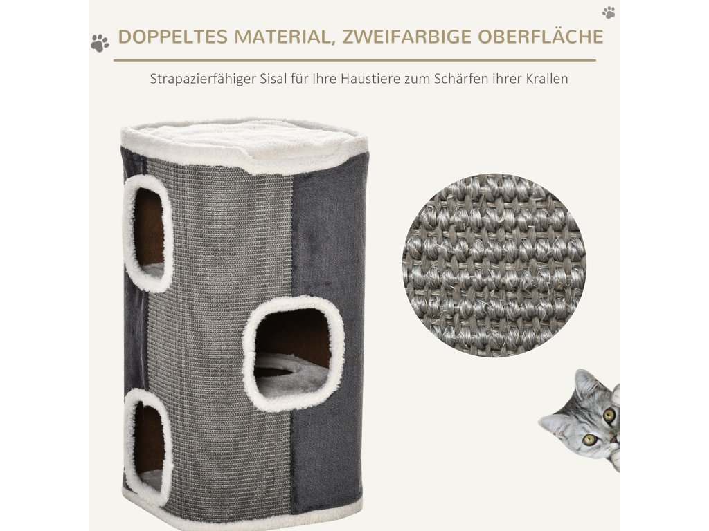 Toto sisalem potažené škrabadlo pro kočky od společnosti PawHut se jistě stane oblíbeným místem vaší kočky. Nabízí skvělé místo na hraní, spaní i úkryt. Tři jeskynní prostory jsou propojeny dvěma velkými otvory uvnitř, což jim poskytuje dvakrát více prostoru pro pohyb a úkryt. Škrabadlo je potaženo měkkým a příjemným materiálem, takže vaše kočky mohou pohodlně podřimovat.