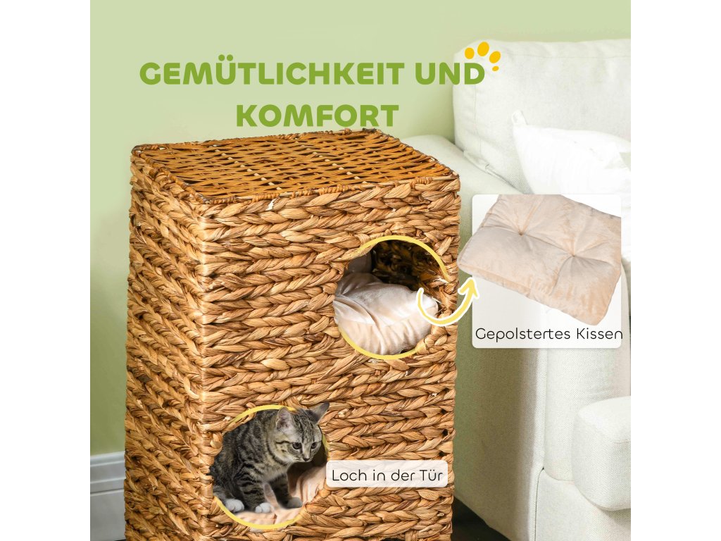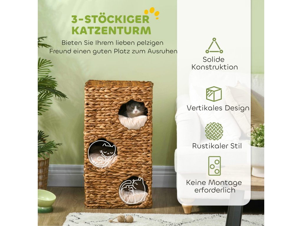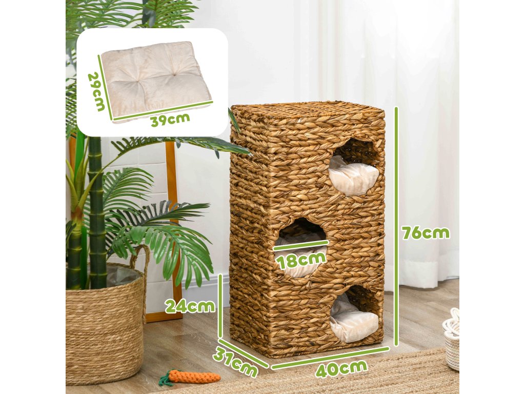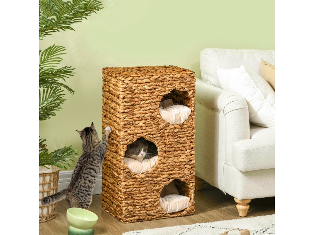 Objevte věž pro kočky PawHut - třípatrový ráj pro vaši kočku! Každé patro je vybaveno omyvatelným polštářem a praktickým otevíráním dvířek, takže váš mazlíček může pohodlně odpočívat a zkoumat. Toto škrabadlo pro kočky je vyrobeno z přírodní trávy z vodního hyacintu a nabízí nejen útulné útočiště, ale také dokonalý povrch pro škrábání. Dopřejte své kočce toto luxusní útočiště a pomozte jí udržet drápky čisté!