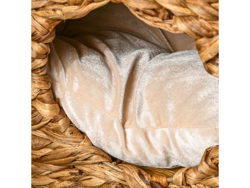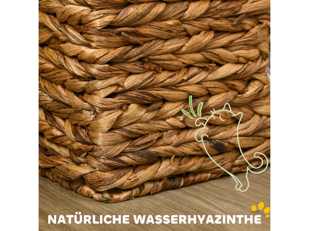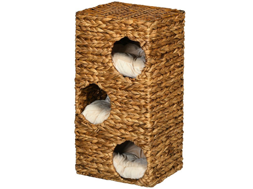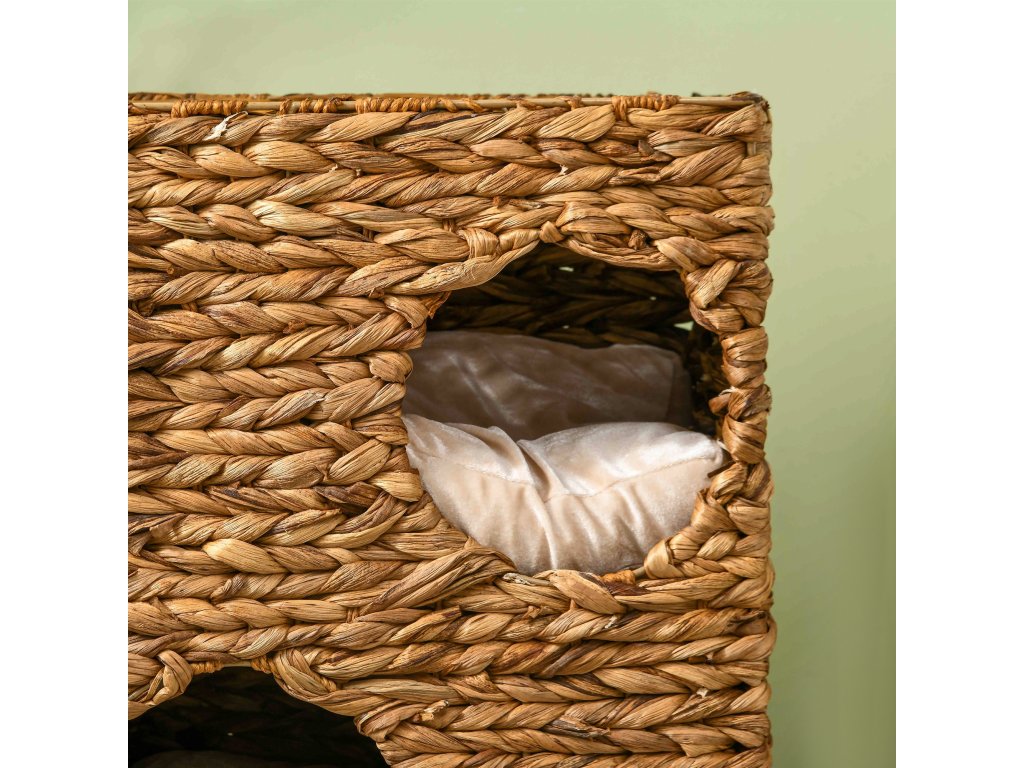 Škrábací sud PawHut 76 cm vysoký se 3 jeskyněmi, omyvatelným polštářem, škrabadlem a věží pro kočky z vodního hyacintu ve světle hnědé barvě | Aosom.de