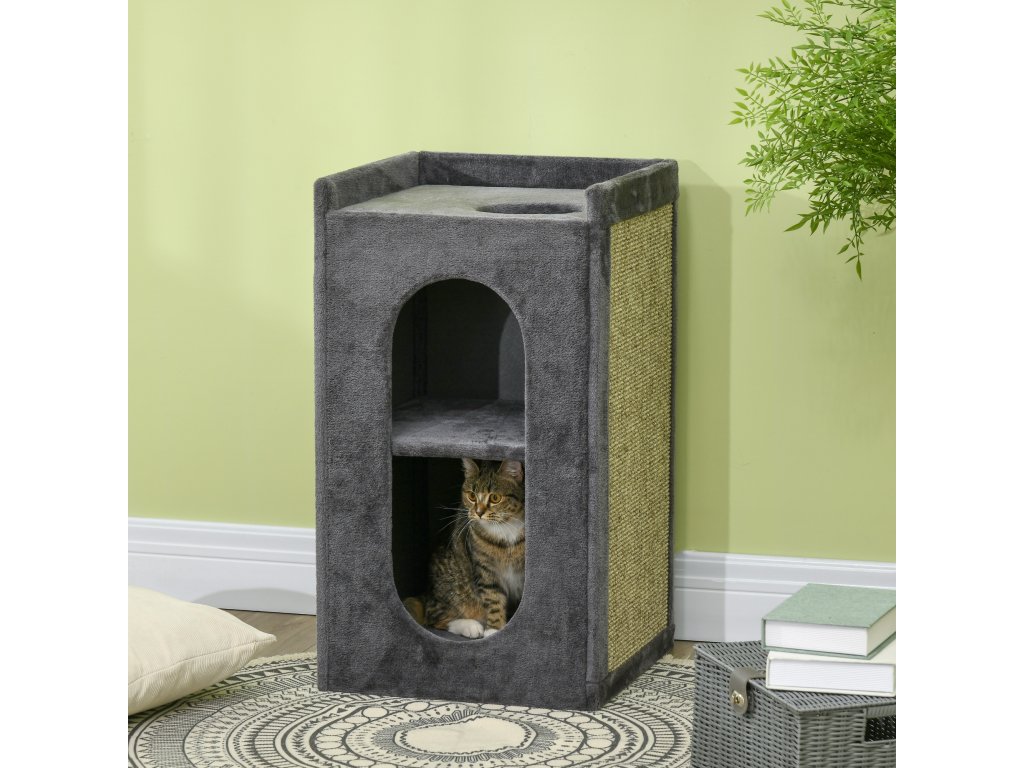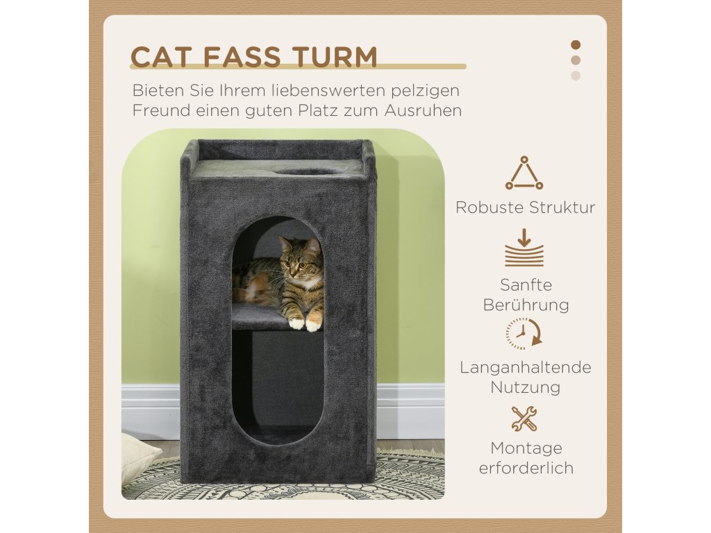 Škrabací sud PawHut se 2 jeskyněmi pro kočky a 2 úrovněmi, lehací plocha se sisalovou škrabací podložkou, plyšový design 45x45x81 cm tmavě šedý pro milovníky koček | Aosom.de