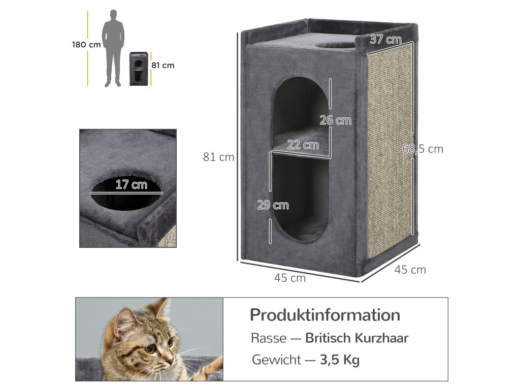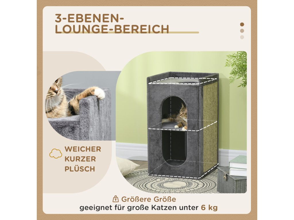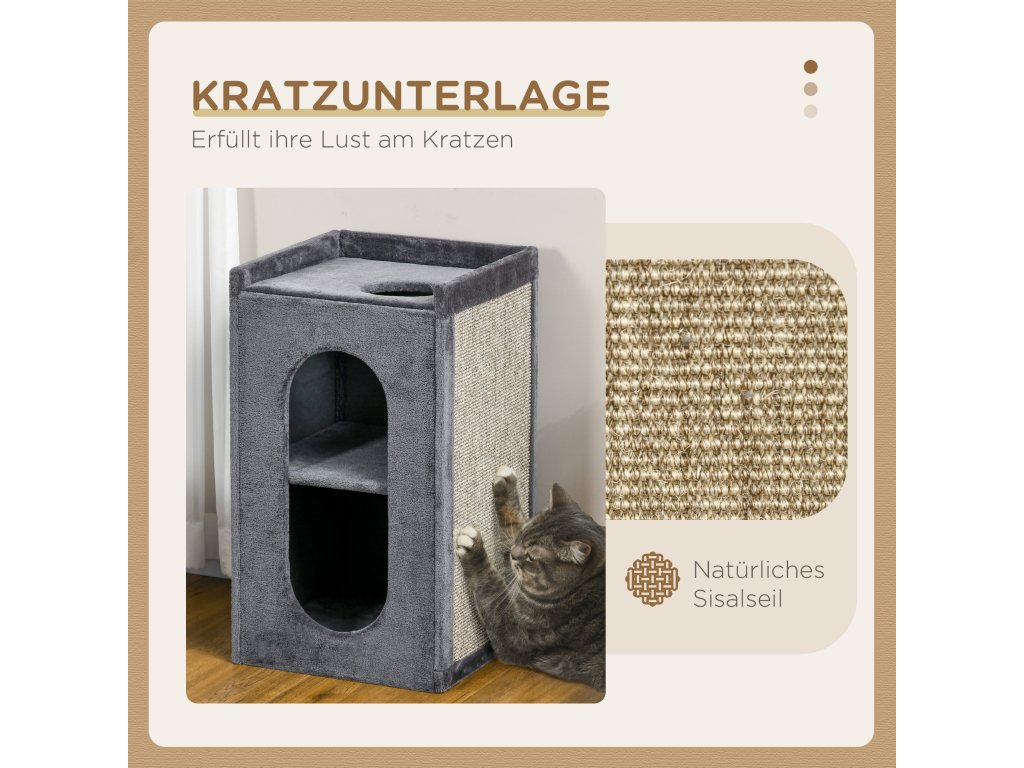Toto škrabadlo pro kočky od společnosti PawHut se stane novým oblíbeným místem vašeho chlupatého přítele. Je to ideální místo k odpočinku, spánku a úkrytu. Dvě kočičí jeskyně umožňují kočkám schoulit se do malých jeskyní a schovat se. Horní lehací plocha nabízí vašim kočkám skvělé místo k pozorování okolí. Škrabací podložka je dostatečně vysoká, aby se na ní kočky mohly škrábat a protahovat. Neutrální barevné tóny se dobře hodí k různým zařízením domácnosti.