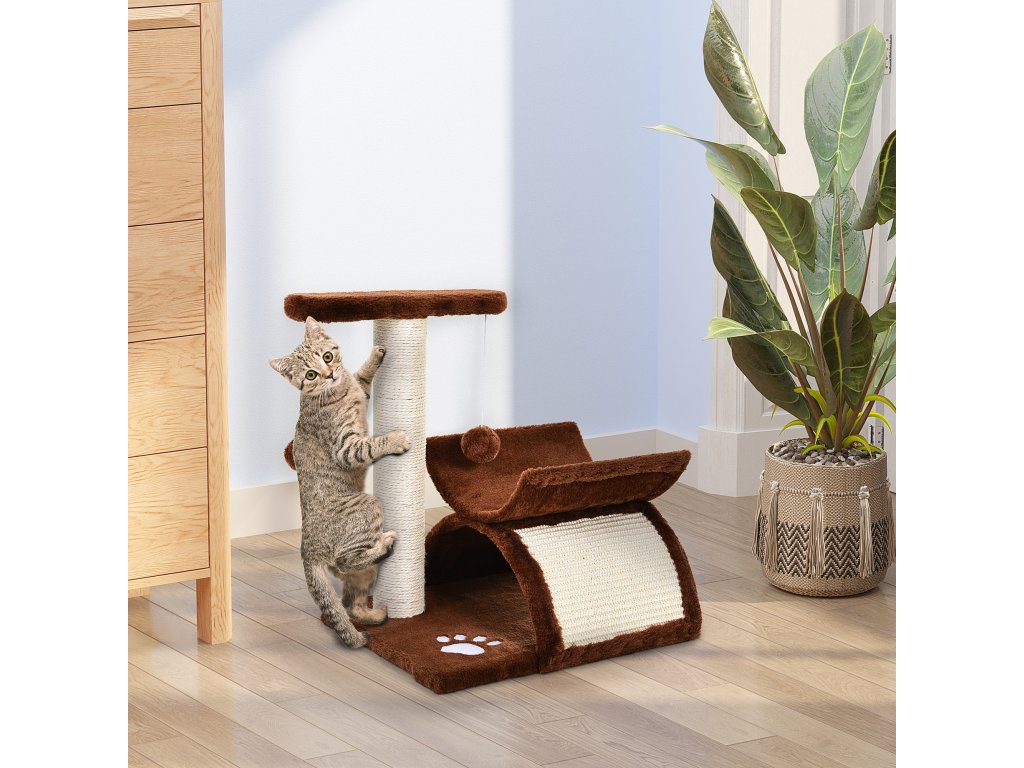 Škrabadlo PawHut, s tunelem, lehací plocha, strom na hraní pro kočky, sisal, hnědá, 40x30x43 cm| Aosom