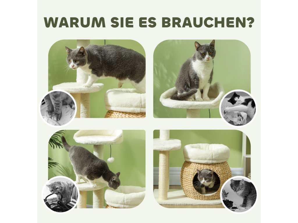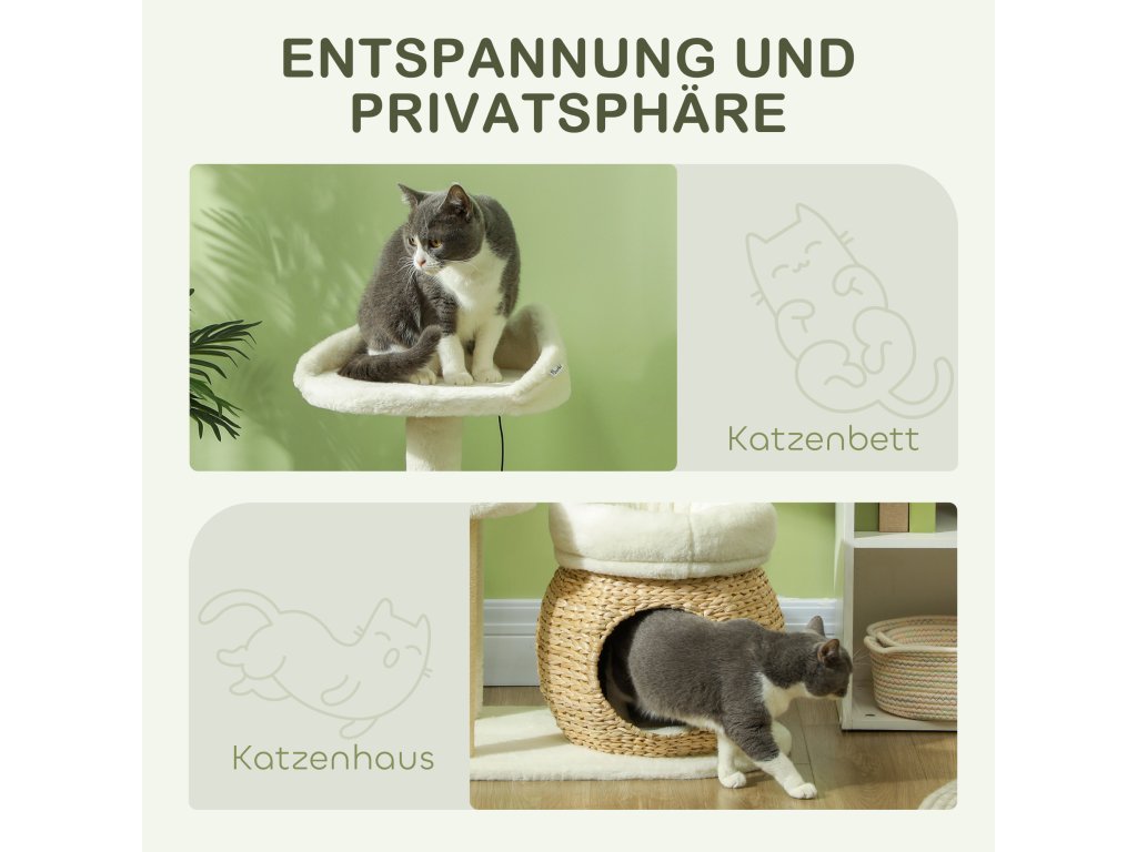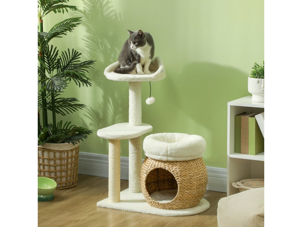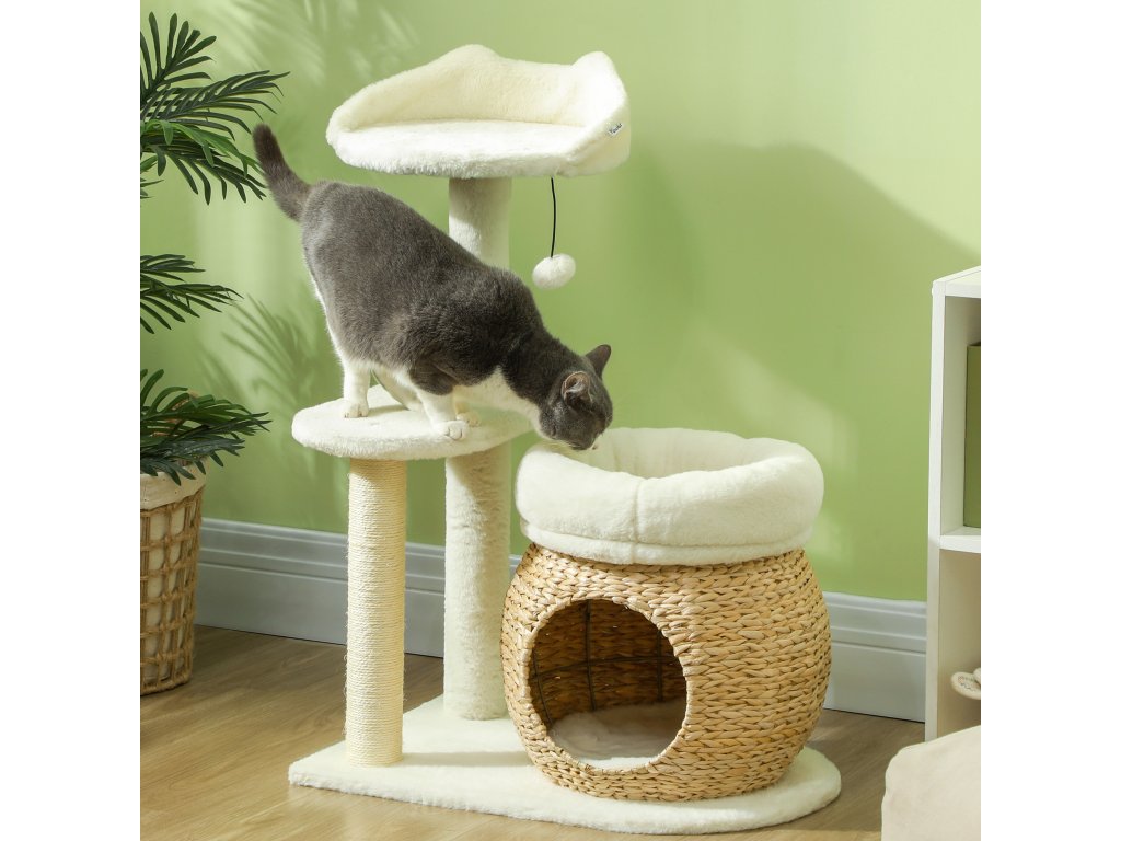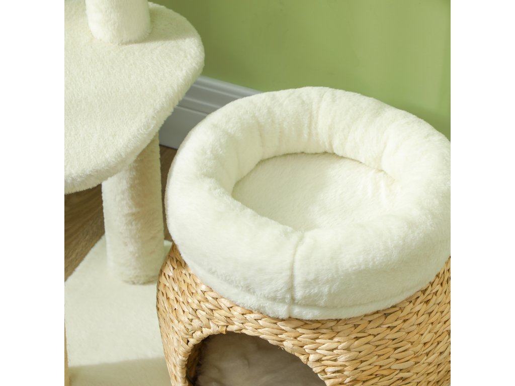 - Přírodní a útulné: Strom pro kočky je vyroben z přírodního rákosu, zatímco pelíšky a plošina jsou potaženy měkkým plyšem. Vzniká tak příjemné útočiště, které vašemu mazlíčkovi poskytne maximální pohodlí