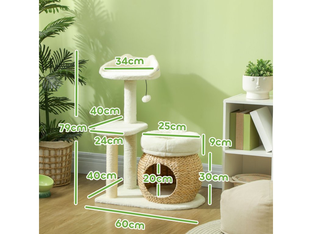 - Údaje o výrobku pro kočičí strom: Celkové rozměry: 60 x 40 x 79 cm, nosnost: 10 kg, vhodné pro 1-2 kočky do 5 kg, nutná montáž