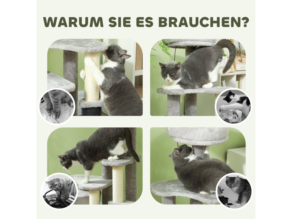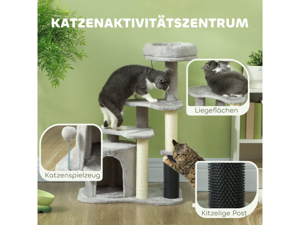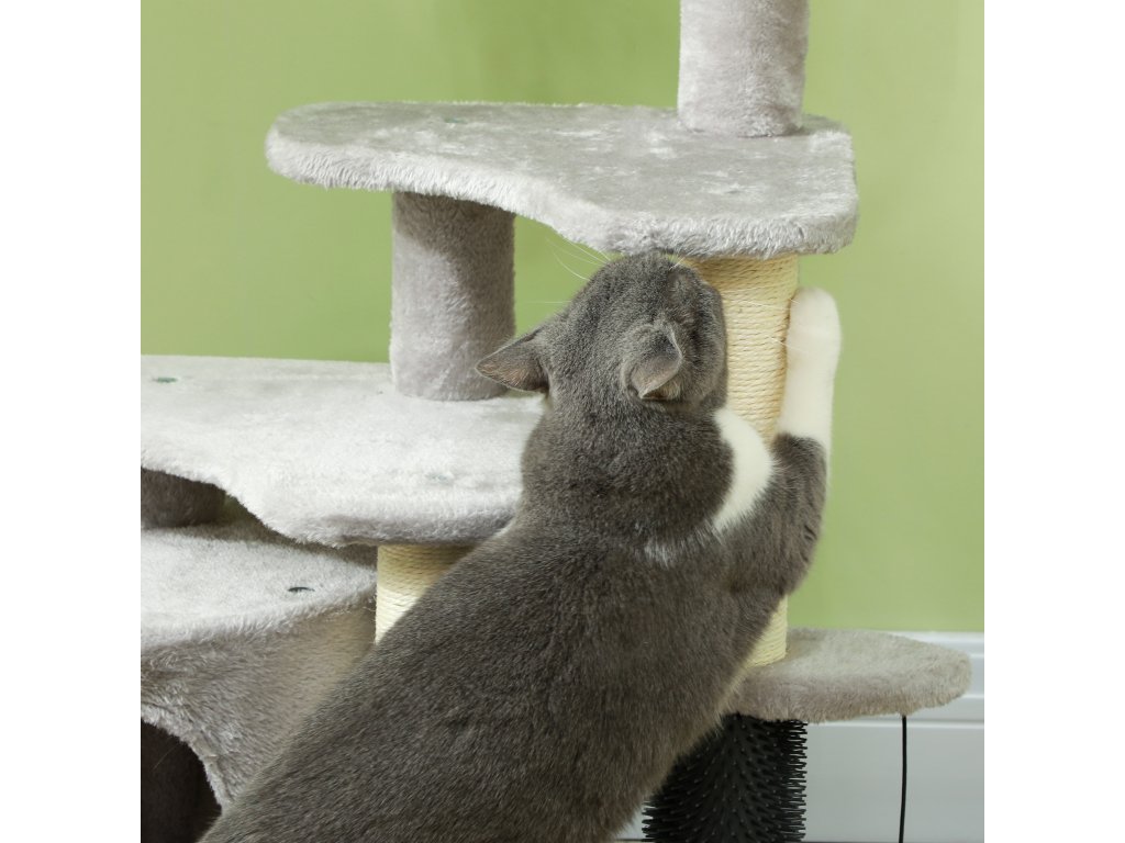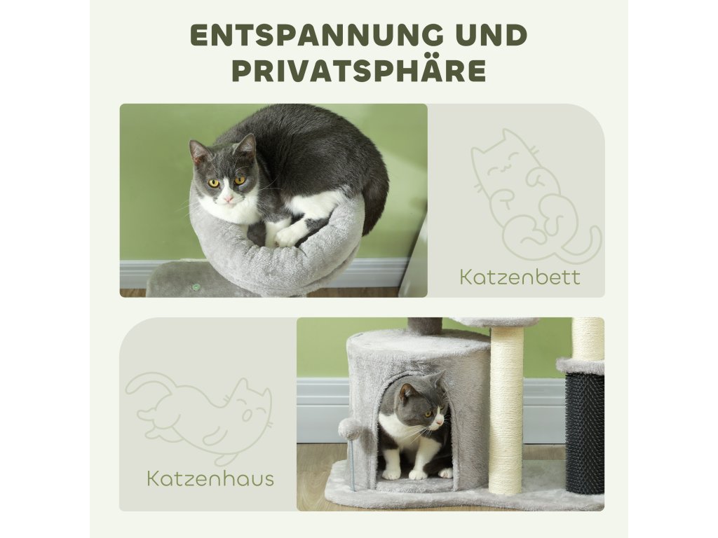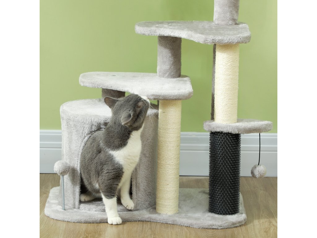 - Kompletní centrum aktivit: Tento kočičí strom obsahuje útulný pelíšek, domeček pro kočky v ústraní, škrabadla, několik úrovní, míčky na hraní a lechtací tyč, které vaši kočku hravě stimulují a zabaví.