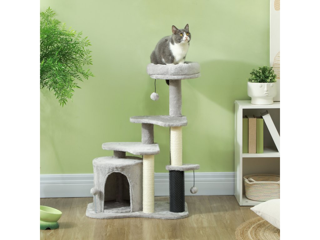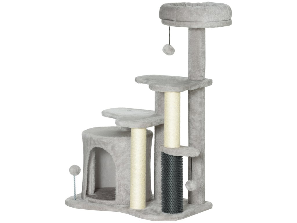 Škrabadlo PawHut 87 cm, kočičí strom s jeskyní pro kočky, pelíšek, míčky na hraní, škrabadlo pro kočky se sisalovými škrabadly, pro kočky do 5 kg, světle šedé | Aosom