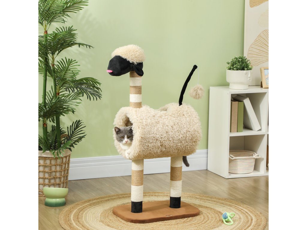 Škrabadlo PawHut 98 cm, strom pro kočky se škrabadlem, tunelem, míčkem na hraní, škrabadlo pro kočky v designu ovce, pro kočky do 5 kg, světle hnědé | Aosom
