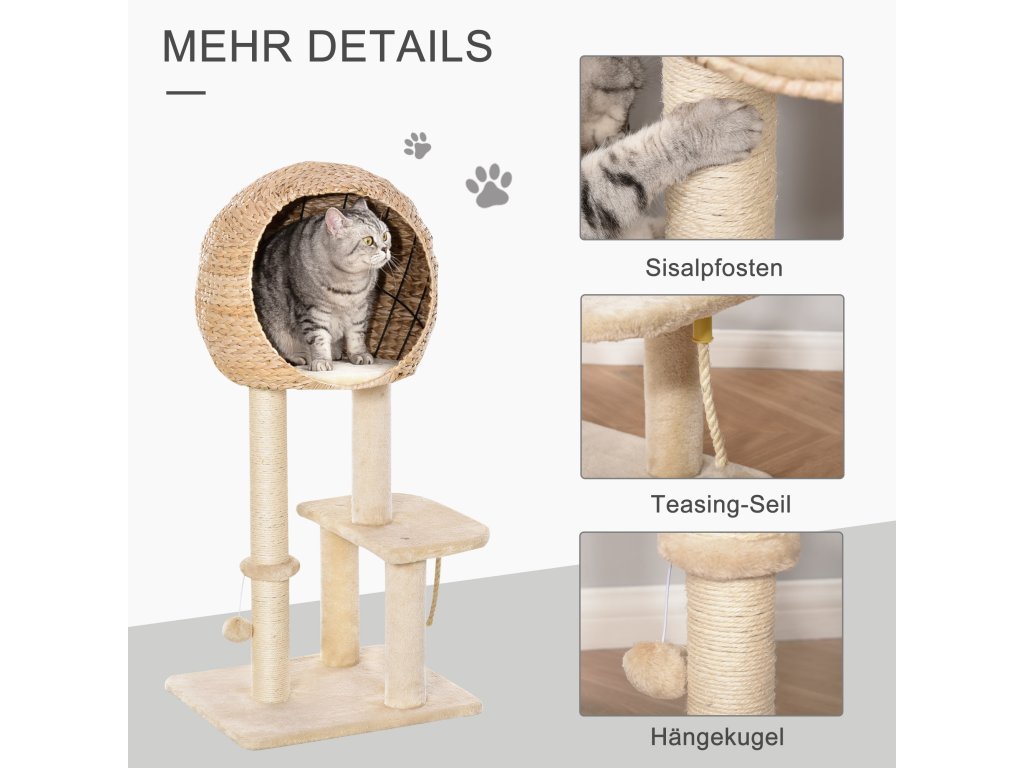Škrabadlo PawHut s jeskyní pro kočky 100H cm pro malé kočky s míčkem a sisalem Béžová | Aosom.de