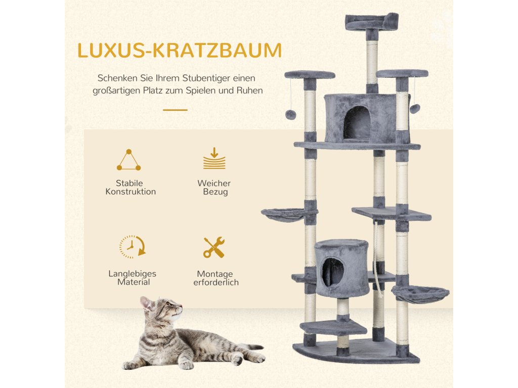 Škrabadlo PawHut velké 200 cm XXL kočičí strom s houpacími sítěmi pro velké kočky ve světle šedé barvě | Aosom.de