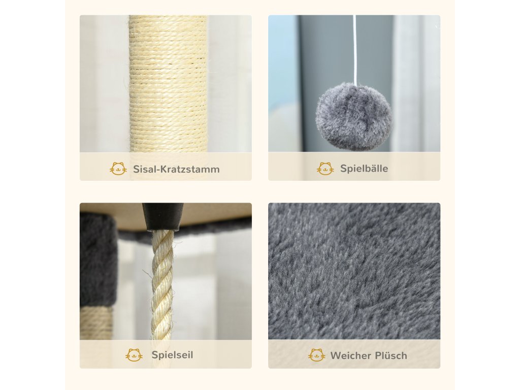 - Chrání váš nábytek: škrabadla se sisalovým provazem poskytují vaší kočce dostatek příležitostí k broušení drápků, takže váš nábytek je ušetřen škrábanců. Integrované hračky nabízejí vaší kočce spoustu rozmanitosti a zábavy.