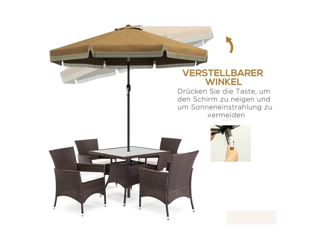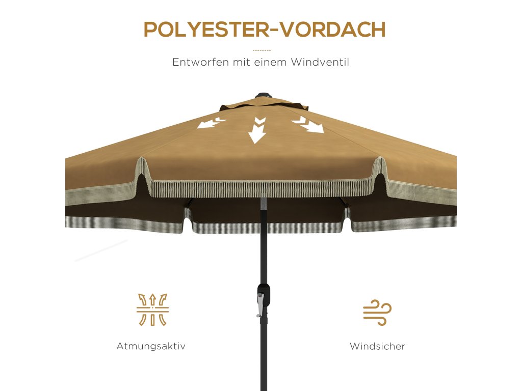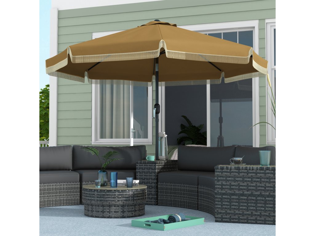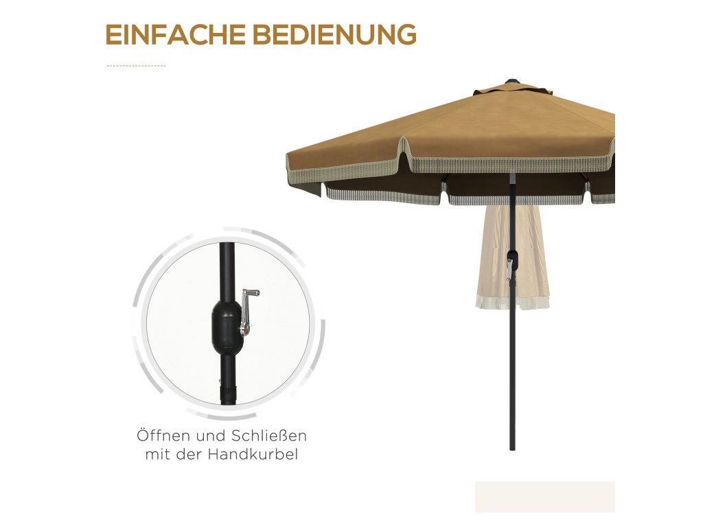 Slunečník Outsunny Ø265 cm s třásněmi, sklápěcí slunečník s 8 žebry, ideální na zahradu a balkon, v barvě khaki | Aosom.de
