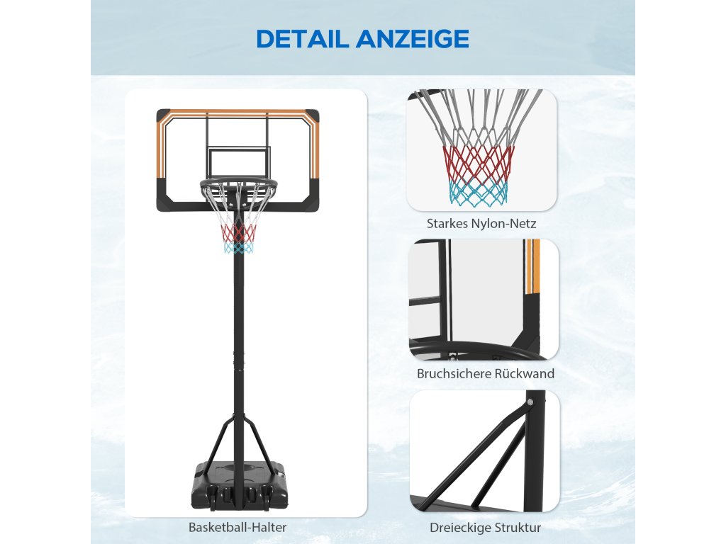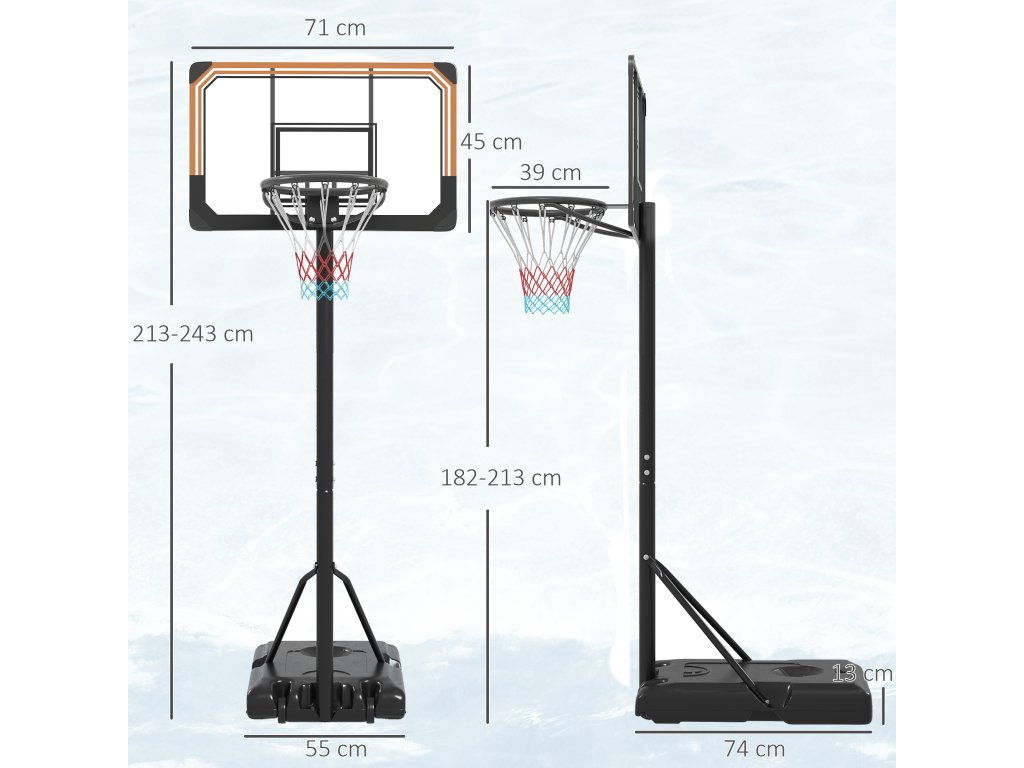 - Údaje o výrobku: Koš na basketbalové koše je vyroben z kvalitních materiálů, které jsou součástí balení: Rozměry zadního panelu: 71L x 2,5W x 45H cm. Nastavitelná výška od 235 do 264 cm. Rozměry základny: 74L x 55W x 13H cm. Nutná montáž
