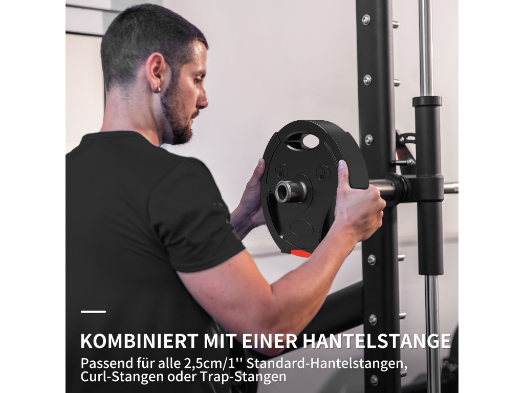 - Standardní uchycení: Vybaveno 2,5cm středovým otvorem, který zajišťuje kompatibilitu zátěžových desek se všemi standardními tyčemi na činky pro bezproblémový trénink